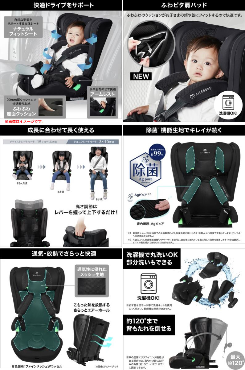 【商品特長】 ・取り付けカンタン「らくらくISOFIX取付」+足元すっきり 「テザーベルトタイプ」。 金具に正しく固定されないと縮まない、ミスユース防止機構も搭載。 ・持ちやすい背面デザインで、持ち運びもスムーズ。 ・肩ベルトが跳ね上がった状態でスタンバイ!お子さまの乗せ降ろしがラクになる「ジャンピングハーネス」 ・すっきりしたサイド形状と乗せやすい低重心設計で、お子さまの乗せ降ろしがラク。 ・衝撃からお子さまをしっかり守る「ヘッドプロテクション2」 ヘルメットなどで使用する発泡材を頭部に使用し、側面の衝撃からもお子さまをガードします。 ・「ナチュラルフィットシート」&「ふわふわ座面クッション」 自然な姿勢をサポートする立体シートと、厚さ20mmのふわふわクッションで快適な座り心地。 ・製品幅440mmの「省スペース設計」だから、家族みんなでゆったり座れます。 ・手や肘をのせて快適「アームレスト」 ・約120°まで背もたれを倒せる「角度調節機構」クルマのシートにピタッとフィットします。 ・15ヶ月から10才頃まで使えるロングユース設計 ・お子さまの成長に合わせてモードチェンジできる「2ステップシート」 | |||||||||||||||