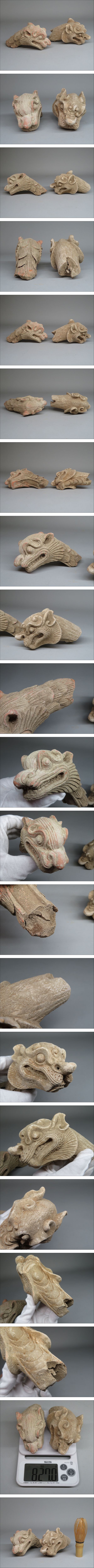 | 「都内コレクター所蔵品」ベトナム(越南)王朝 陶製龍頭 一対 建築装飾 安南 ◆加彩 発掘品 彩文土器 彩陶壺 | ||||