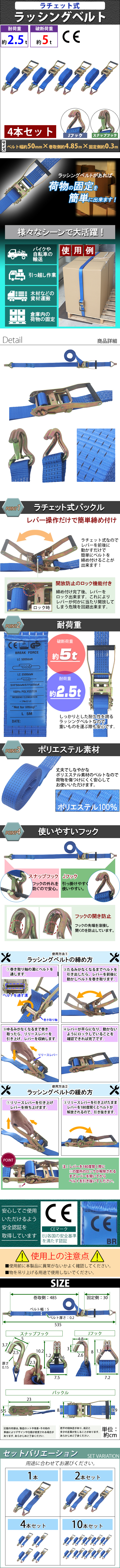 | 商品名 | 送料無料 ラッシングベルト ラチェット式 4本セット 全長約5m 幅約50mm 耐荷重約2.5t 破断荷重約5t 約2500kg 約5000kg Jフック スナップフック タイダウンベルト 荷締め バンド ベルト フック 積載 車載 固定 引越し 運搬 荷物 トラック J型 rbeltt015t |