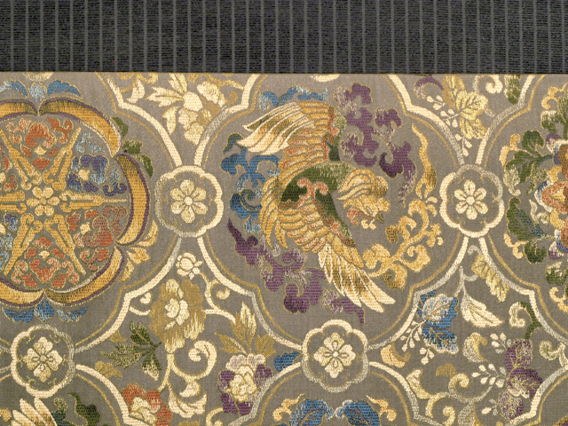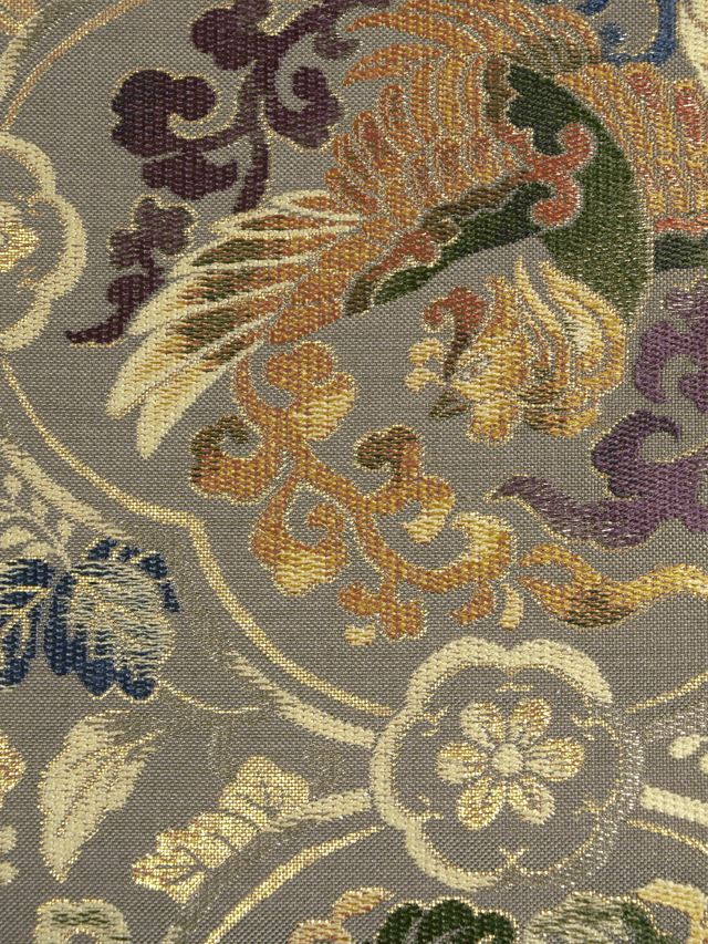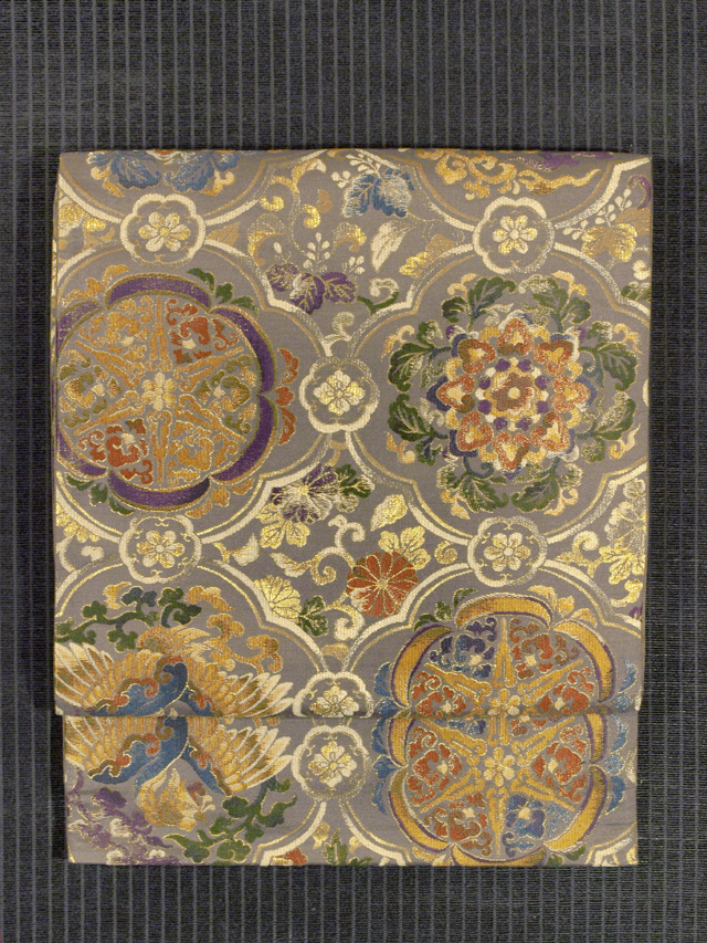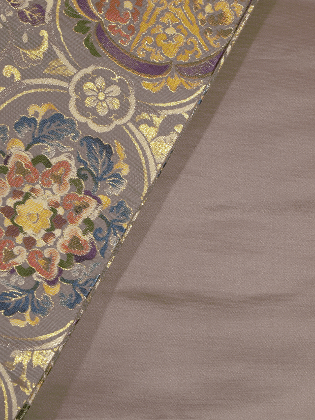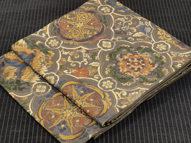 やや淡い藍媚茶(あいこびちゃ)色の地に、牡丹と菊の花唐草の地紋と宝相華(ほうそうげ)、鳳凰(ほうおう)などの文様が織り込まれている西陣織の袋帯です。 格調高い意匠が品の良いカラフルさをともなった色糸と深みのある輝きの金糸で織りあらわされていて、モダンな豪奢さが感じられます。完成度の高い意匠です。 ユーズド品で、うっすらとした前の折り跡と結びジワがありますが、そのほかにしみやよごれ、褪色などのダメージは見あたらず、きれいな状態です。 |