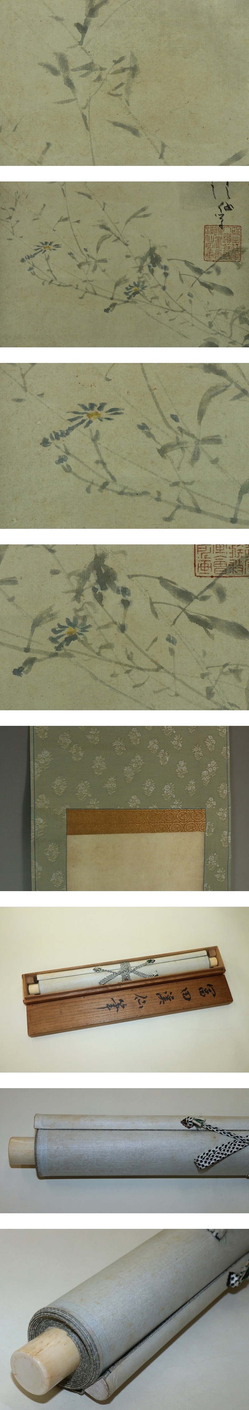富田渓仙 とみた-けいせん(1879-1936) 日本画家。福岡県生まれ。 狩野派・四条派を学んだのち、南画の精髄を極め、自在な境地に達した。 本紙は、染み、汚れ、折れ、皺、虫食い痕、ヤケがあります。 表装は、染み、汚れ、軽い折れ、軽い皺、軸先にヒビがあります。 【サイズ】 作品 横約30cm×縦約121cm 表装 横約44cm×縦約196cm |
