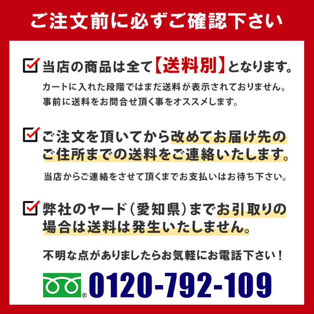 ・弊社ヤード(愛知県春日井市)での引渡しであれば、送料は発生致しません。
