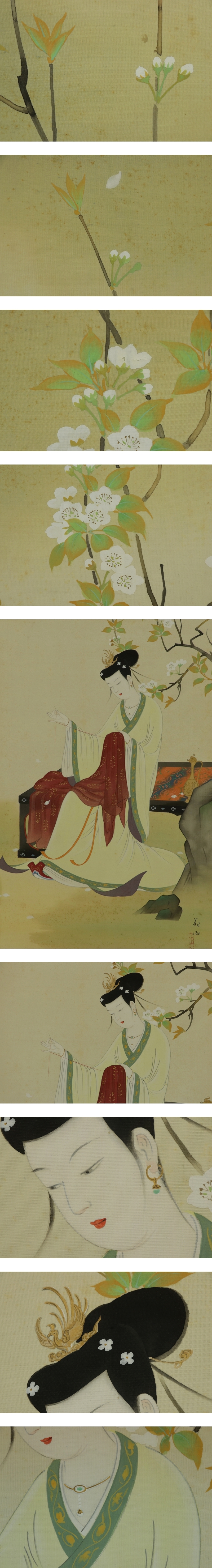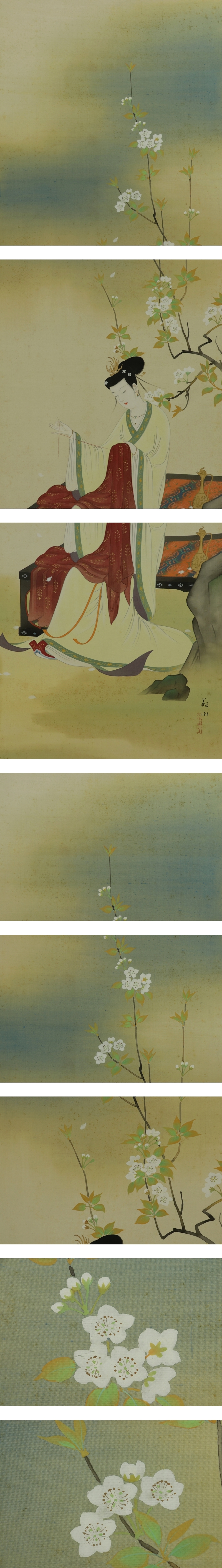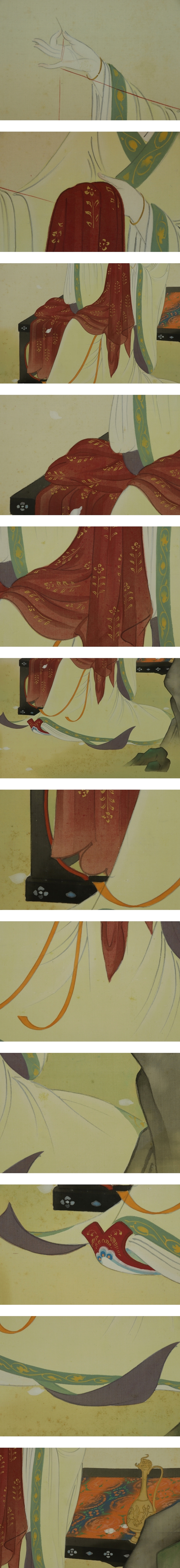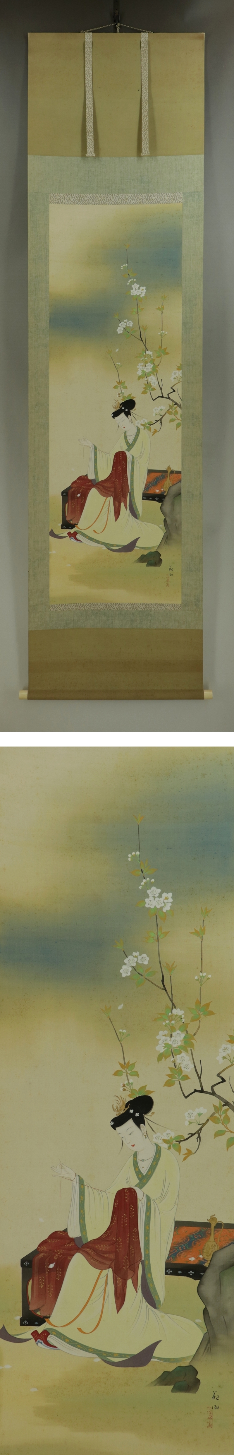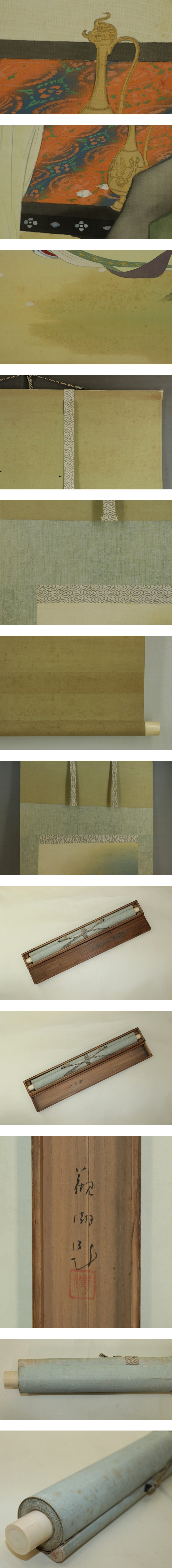 織田観潮 おだ-かんちょう 小堀鞆音に師事。尾竹国観。 明治22年12月東京生まれ。 新大和絵・文展日展委嘱。 人物・花鳥を得意とする。昭和36年歿。 本紙は、染み、汚れ、ヤケがあります。 表装は、染み、汚れ、軽い皺、虫食い、破れ、ほつれ、ヤケ、軸先にヒビがあります。 【サイズ】 作品 横約41.5cm×縦約126cm 表装 横約55cm×縦約210cm |