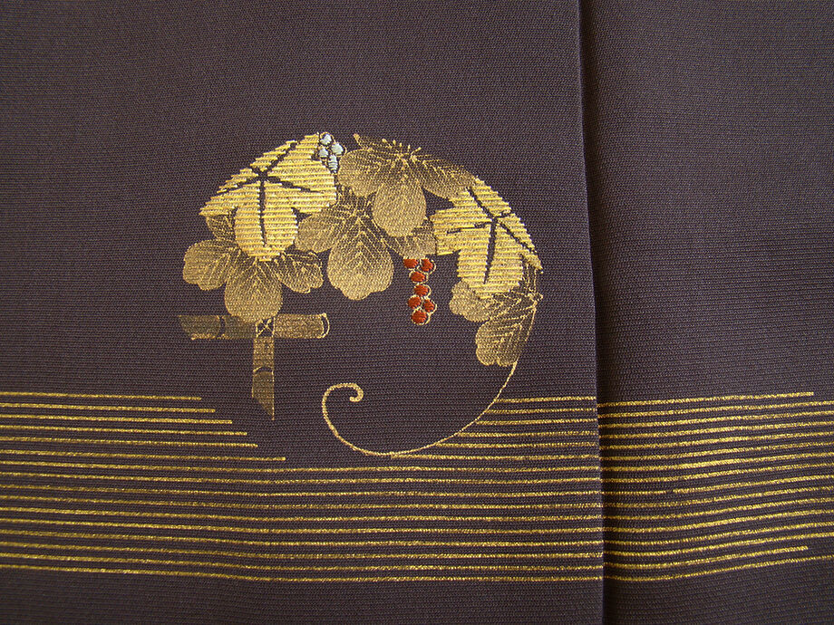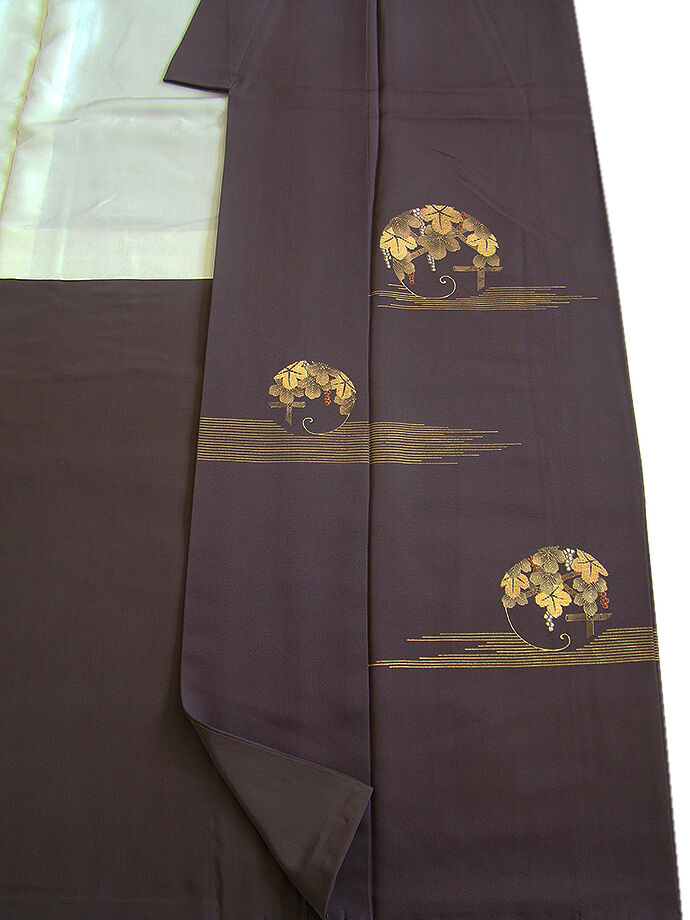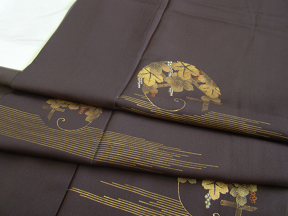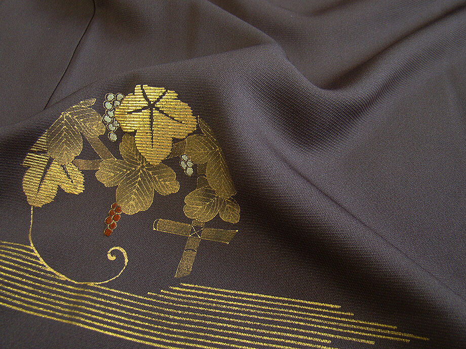 | 商品説明 | こちらのお品は「袷」でございますので、10月~5月までお召頂ければと思います。 しなやかで柔らかな手触りの着心地良い重めのちりめん地の生地、 シックな渋い葡萄鼠色地に葡萄蔦文の金彩加工染に金糸入り、 八掛は紫鼠色(正絹)、バチ衿仕立て、幅広い年代の方にお召頂けます。 |
