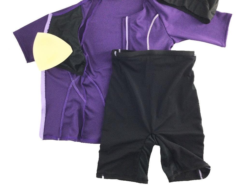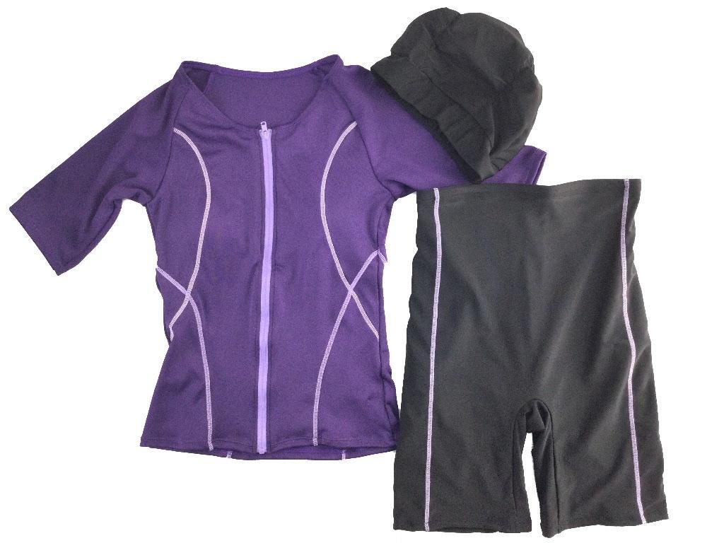 レディース水着 3点セット フィットネス キャップ付 半袖 大きいサイズ 4L 杢パープル 收藏