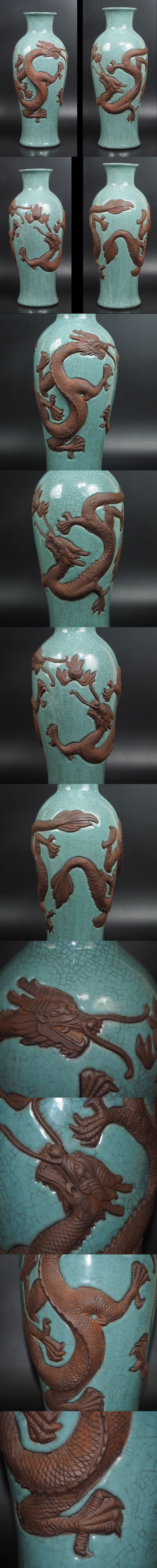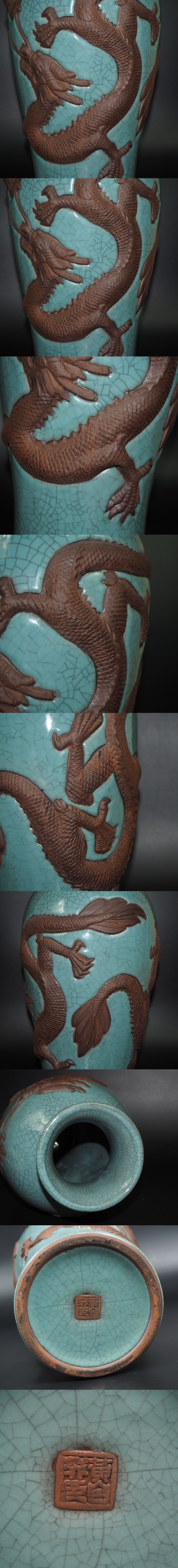 【金富士】作家物 浮彫龍紋青磁花瓶 在銘 高45cm 検/暁芳窯 醴陵窯 康熙雍正乾隆道光 中国古玩骨董 收藏