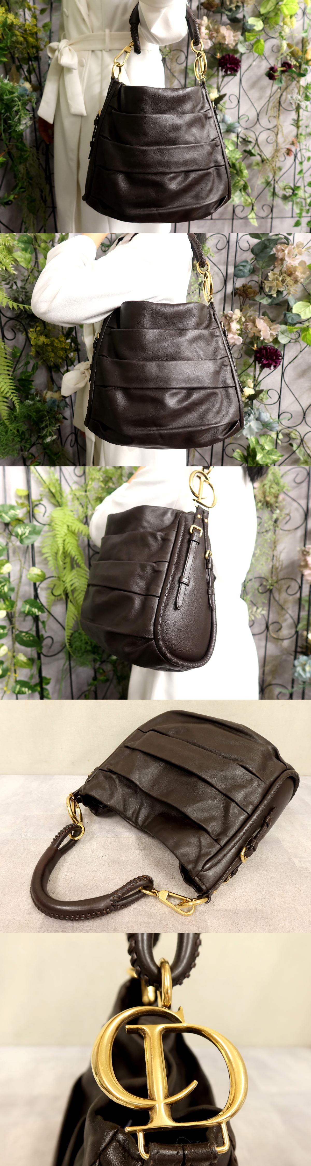 超美品●クリスチャン・ディオール●プリーツ ホーボー セミショルダー●ナッパ レザー 本革●ハンド バッグ●ダークブラウン●B5●Js61696 收藏