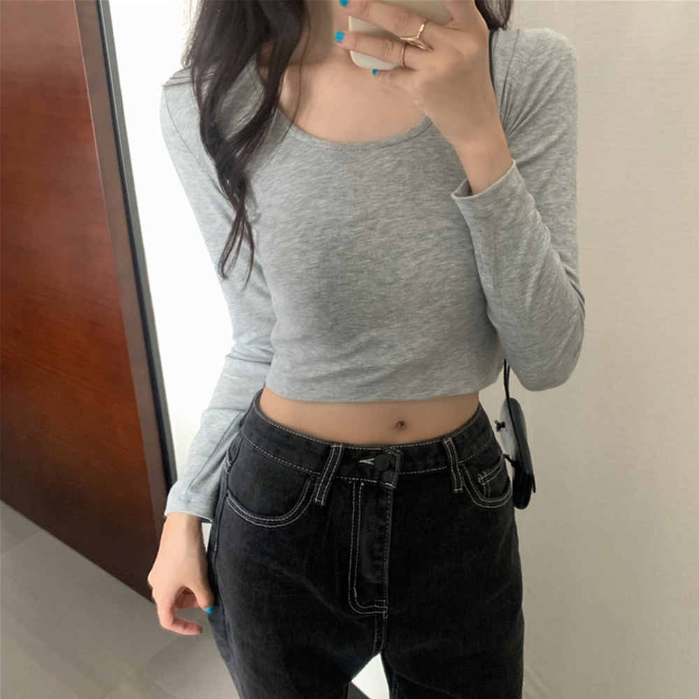☆ グレー ☆ Lサイズ ☆ シンプルトップス Uネック 長袖Tシャツ Tシャツ 長袖 レディース ショート丈 長袖Tシャツ 長袖tシャツ tシャツ 收藏