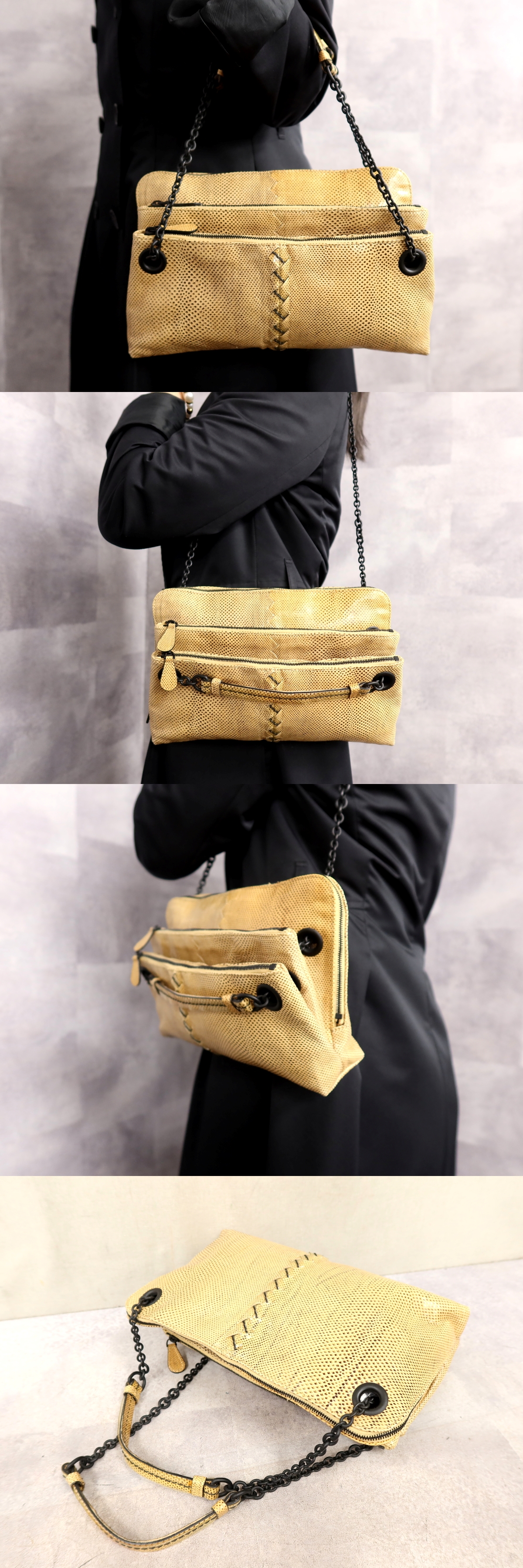 ●超美品●ボッテガ ヴェネタ●イントレチャート●リザード 本 トカゲ 革●チェーン ショルダー バッグ●クリームイエロー 黒●Js63135 收藏