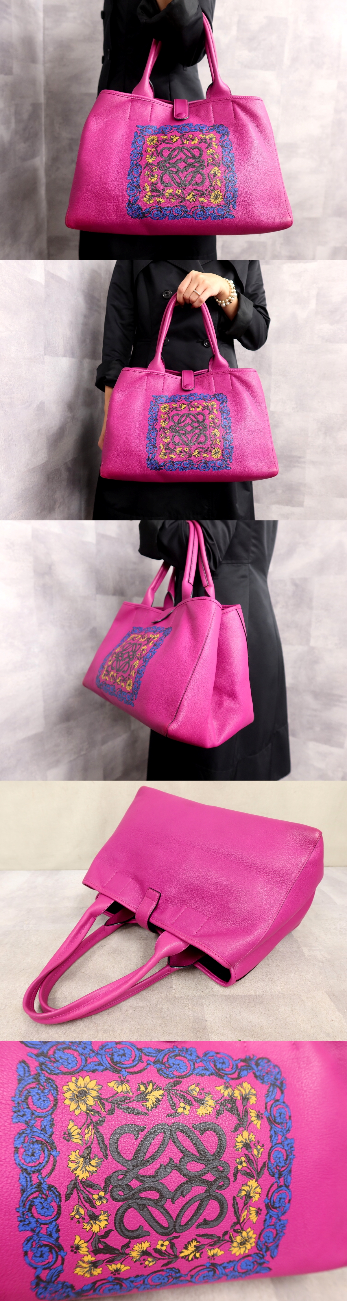 ●超美品●LOEWE ロエベ●アナグラム●カーフ レザー 本革●トート バッグ●ビビットピンク ブルー イエロー●腕掛け●B5 かばん●Js63077 收藏