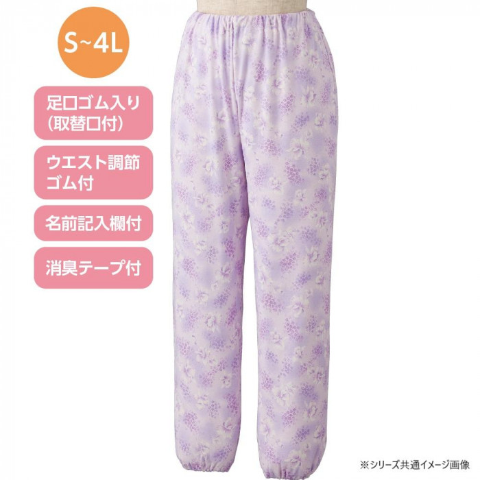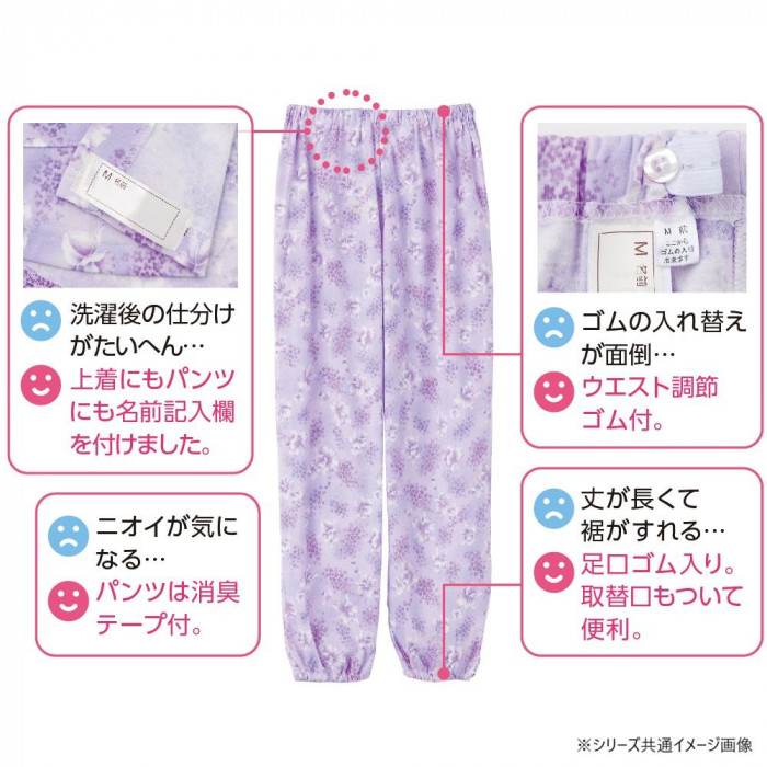 | 足口ゴム入り(取替口付)、消臭テープ・ウエスト調節ゴム・便利な名前書きスペース付き。洗い替えにもおすすめのパジャマパンツ。 ※柄は若干変更になる場合もございます。 |