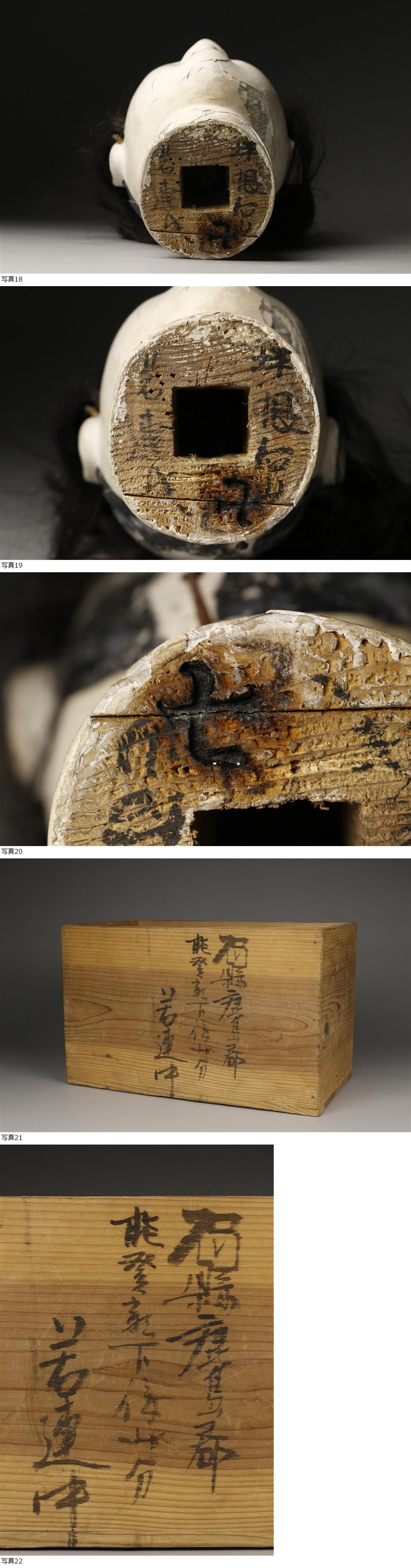 ① 260227F10* * * 商品詳細 * * * ここでしか出逢うことのできない唯一の美をご紹介させて頂きます。 非常に時代感のある浄瑠璃人形、男形の頭です。 肌地からは長い年月の経過が伺えます。 端正に造り込まれていることも伺え、当時は美しい姿だったことが想像されます。 当時の華やかな文化を想い浮かばせる時代の逸品です。 この機会に是非お求めください。 ■商品内容/人形、箱 ■サイズ/横16cm×高22.5cm×奥行13.5㎝ 箱:横29.5cm×高18.5cm×奥行16㎝ ■状態/スレ、キズ、表面にひび割れ、剥げ、虫食い、サビ、髪の毛に抜け、経年による傷み、 箱にスレ、キズ、割れ、シミ、欠け、汚れがございます。 髪の毛は非常に抜けやすくなっており、箱蓋が欠損しています。 ※写真にてご確認、ご了承の上ご入札下さい。 * * * 支払詳細 * * * !かんたん決済 * * * 発送詳細 * * * 入金確認後3営業日以内に発送致します。 ※直接引き取りも可能です。 60~160サイズにつきましては 佐川急便、ゆうパックのどちらかで発送いたします。 ゆうパック発送の場合、弊社の発送日から追跡サービスに問合せ番号が反映されるまで 約1日ほどお時間がかかりますのでご了承下さい。 * * * 注意事項 * * * 運送中の破損があった場合は速やかに当社までご連絡下さい。 保険を利用するのに受取連絡後に運送会社による現場での破損状況確認が必要となります。 勝手に返送されますと保険の適用外となりますのでご注意ください。 * * * * * * お問い合わせ:082-236-8669 |