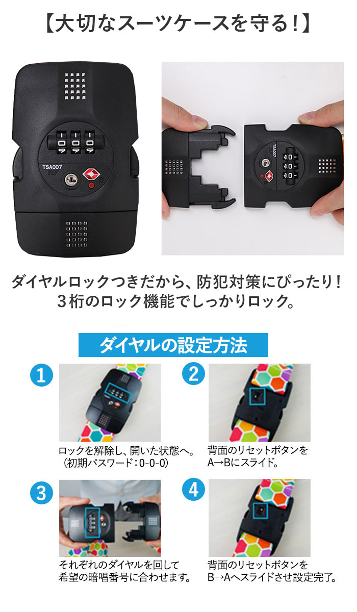 | 商品説明 | ・・【ダイヤルロックで防犯対策◎】 ・海外旅行や出張などで大活躍!「スーツケースベルト TSAロック付き」が登場。 ・【大切なスーツケースを守る!】 ・ダイヤルロックつきだから、防犯対策にぴったり!3桁のロック機能でしっかりロック。 ・【いろんなスーツケースにフィット】 ・長さ調節ができるから、お家のいろんなスーツケースに対応可能◎家族で共有もできちゃう! ・【丈夫なポリエステル素材を採用】 ・耐久性に優れ、型崩れがしにくいポリエステル素材。海外旅行など長時間の使用も安心の作り。 ・【たくさんのデザインをご用意】 ・ポップでおしゃれな豊富なデザインから、お好みをチョイス!空港レーンで一目で見つけられる♪ |