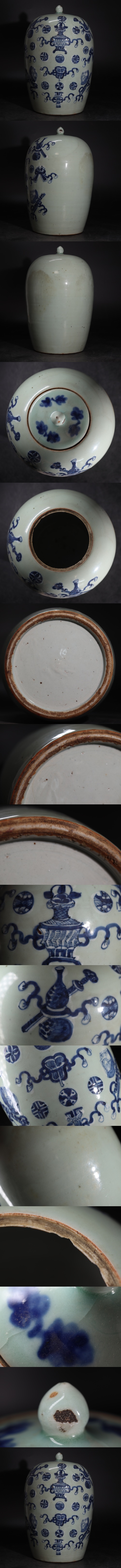 | 時代 青磁 染付 宝尽くし文 蓋壺 / 清 中国美術 蓋物 壺 煎茶飾 .G4114 |