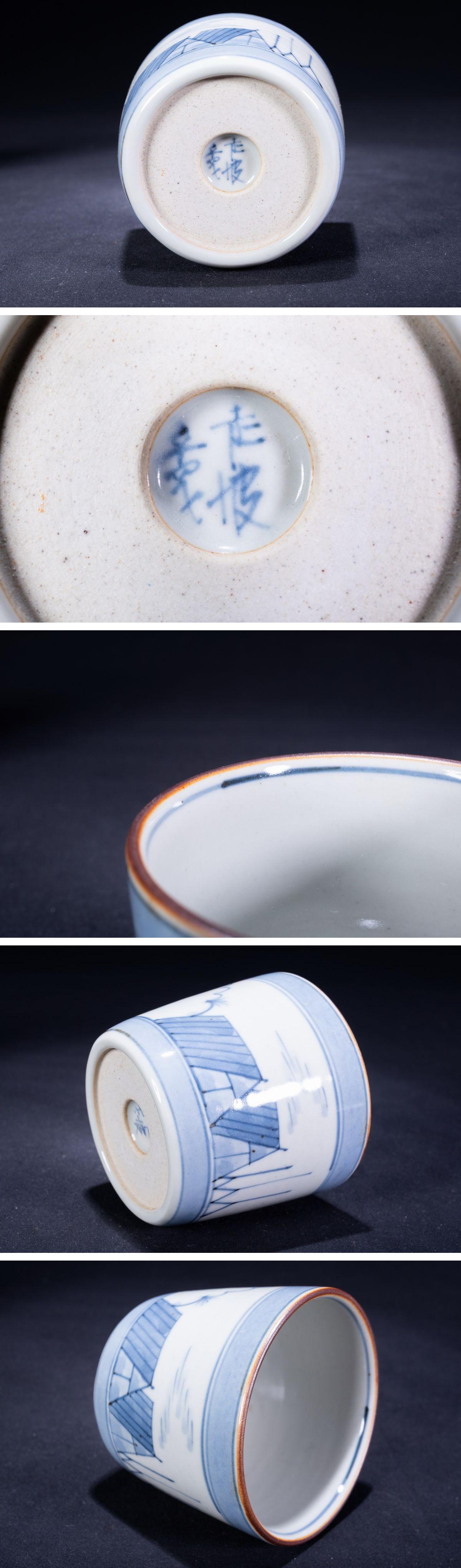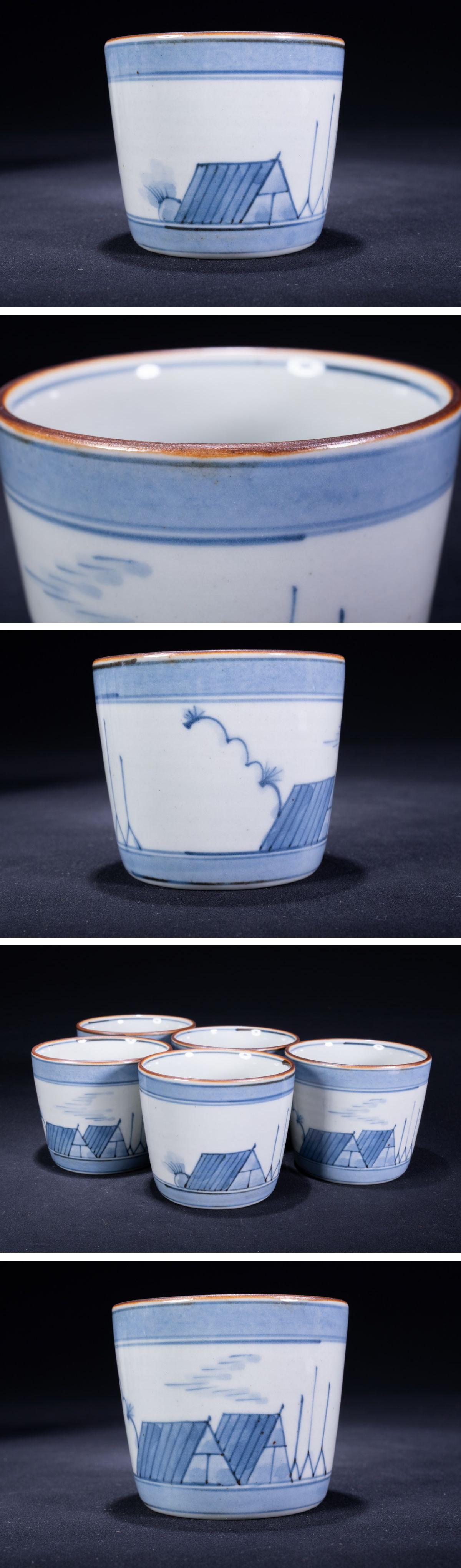 【珍品堂】1円から 佐藤走波 作 在銘 家屋柄 染付 5客 蕎麦猪口 食器 骨董品 アンティーク 古美術 時代物 径7.7cm M-A55X-F3 收藏