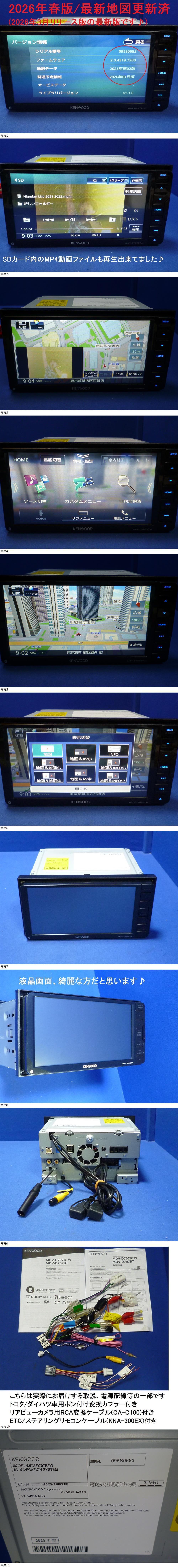 | 商品紹介 | ★★★地図データ最新版に更新済★★★ 地図データ 最新版・2026年春版3月リリース版(2025年02版) ファームウェア 最新版(2.0.4319.7200) 開通予定情報 最新版(2026年第01月版) メモリーナビ SDナビ KENWOOD ケンウッド MDV-D707BTW シリアルNO.095S0683 2020年製 外形寸法(W) x (H) x (D)206mm x 104mm x 174mm 埋込寸法(W) x (H) x (D)178mm x 100mm x 160mm 【主な特徴】 「高画質」と「高速レスポンス」を追求する彩速テクノロジー 直感的にわかりやすく、使いやすいアクティブオーバーレイGUI 4カ国の言語に切り替え可能マルチランゲージ(多言語)対応 ハイレゾ音源に対応した充実のオーディオ機能 いつでも、どこでも、ドライバーにとって使いやすいナビゲーション。 スマートフォン連携でより便利に快適に高度なナビゲーション機能をさらに拡張。 安心・安全をタイムリーにサポート。万が一の時に備えた新機能で安心ドライブ。 高精細な録画と安心・安全なドライブのために 前も後ろも高画質ダブル録画、フロント/リア対応ドライブレコーダーと連携 取り外すまで問題なく使用出来ていた物になります。 出品に辺り、卓上電源にて下記動作確認・写真撮影しております。 (写真は一部流用してます) 写真2枚目~6枚目と下記写真はお届けするナビの現物写真です。 ボタン部分の文字剥げもなく綺麗な方だと思います♪ 液晶画面、目立つ傷等なく綺麗な方だと思います♪ タッチパネルズレありません。 ・ナビ基本操作:OK ・地デジ フルセグTV&ワンセグTV視聴:OK ・USB、音楽ファイル再生:OK ・iPhoneケーブルでUSB接続、iphone音楽ファイル再生:OK ・SDカード、音楽ファイル再生:OK ・DVD再生:OK ・CD再生:OK ・本体内へCD録音&再生:OK ・GPS受信:OK ・スピーカーからの音出し:OK ・Bluetooth接続、スマホ内音楽再生確認:OK ・マイク接続、ハンズフリー通話確認:OK ・ラジオ受信:OK ・パネル開閉/角度調整:OK ・ユーザー設定の初期化:済み お届けは下記になります。 カーナビ本体、 電源配線(トヨタ/ダイハツ車用ポン付け変換カプラー付き)、 (走行中にDVD、TVが見れるような配線加工されてました)、 GPSアンテナ、 フルセグ地デジアンテナコード(エレメント接続部分も問題ありません)×4、 新品フィルムアンテナ(両面テープ付き)×4、 マイク、 USBコード(本体直付け)×2本、 ETC/ステアリングリモコンケーブル(KNA-300EX)、 リアビューカメラ用RCA変換ケーブル(CA-C100)、 取扱説明書、 取付説明書、 になります。 B-CASカードレスタイプです。 問題なくフルセグ受信、視聴出来ております♪ 本体背面に・・・ ケンウッド製リアビューカメラ「CMOS-230/230W」入力や、 車両アンテナからの入力、 リアモニターへの映像出力、 ドライブレコーダー(DRV-MN940BまたはDRV-N530)からの映像入力、 ドライブレコーダーDRV-R530からの映像入力、等が有ります♪ ドライブレコーダーとの連携には ETC/ステアリングリモコンケーブル(KNA-300EX)が必要です。 汎用バックカメラを接続する場合は、 汎用RCA変換ケーブル(CA-C100)が必要です。 上記付属品に含まれてない場合は、必要に応じてご用意ください。 ナビ製品詳細ページ ←クリックしてご覧頂けます 取扱説明書 ←クリックしてご覧頂けます 取付説明書 ←クリックしてご覧頂けます 比較的綺麗な方だと思いますが、こちらは中古品になりますので、年相応の使用感や小傷、汚れ等ございます。 出品に辺り写真に写っている動作確認は確認出来ておりますが 短時間での確認となり、その他全ての動作確認を出来ている訳ではございません。 保証は有りませんので、その点ご了承の上、ご入札願います。 また電源配線など、途中でカットしている場合もございますし、 加工している場合もございます。 必要に応じて、取付の際、加工が必要な事もございます。 配線コード関係はビニールテープ等の粘着が残っている場合もございます。 ツメ等もカケが有るかもしれません。 いずれも動作には支障ありませんし、取付業者は手慣れている事だと思います。 配線、コード関係はあくまでおまけとお考え頂き ご理解の上、ご入札願います。 取付方法、ご使用方法によって破損、故障する場合も有りますし、 同商品の一部差し替えによる返品防止の為、 ご返品、ご返金は一切出来かねます。何卒ご理解願います。 万一、運送トラブル等で破損の際は、運送保険にてご対応願います。 ------------------------------------------------- 送料一律1500円 (北海道、沖縄は送料2500円になります) お支払は落札価格+送料になります。 当方お休みを除き14時までにかんたん決済受付確認出来ましたら 即日発送致します。 |