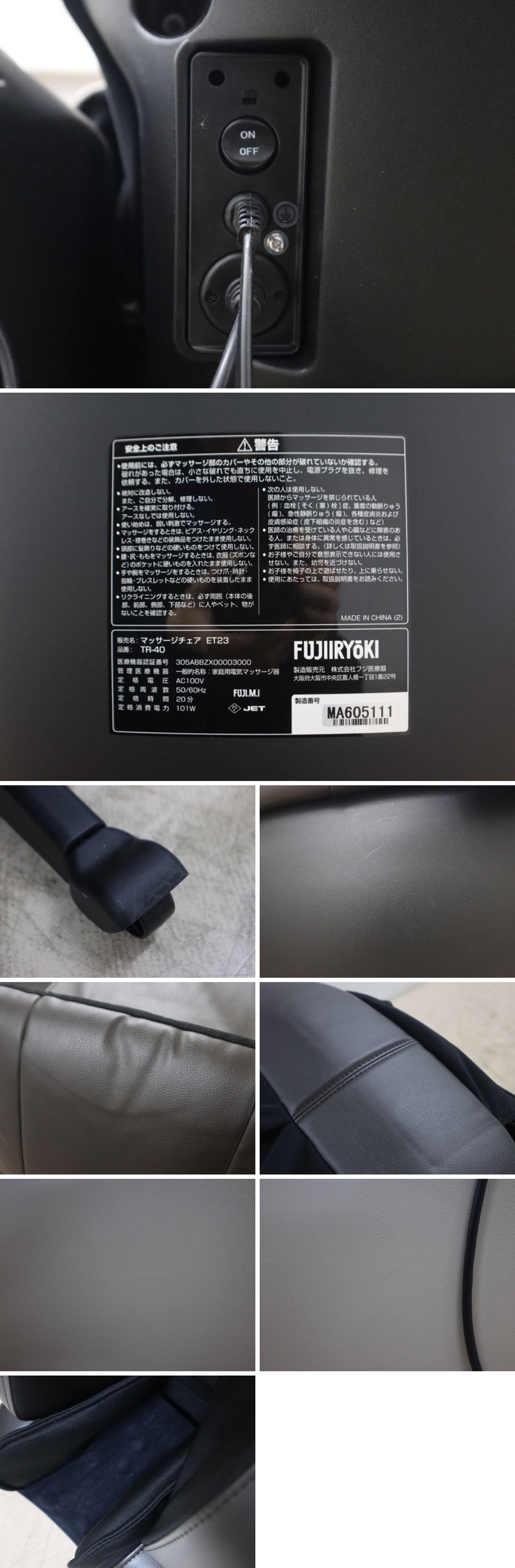 【仕様】 型番:TR-40 本体寸法:通常/(約)幅69×奥行120×高さ106cm(脚部収納時)、リクライニング時/(約)幅69×奥行185×高さ60cm(脚部最大使用時) 本体質量:(約)48kg 定格電源(50/60Hz):AC100V 定格時間:20分 オートタイマー:約15分 リクライニング角度:約118~約169度 張り地:PVCレザー カラー: ベージュ×ブラウン ※メーカーHP参照(画像は100%正確では御座いませんのでご心配なお客様は世田谷区船橋の倉庫でご覧頂けます。色味による返品、返金は一切お受けできませんのでご了承の上、ご入札をお願い致します。) |