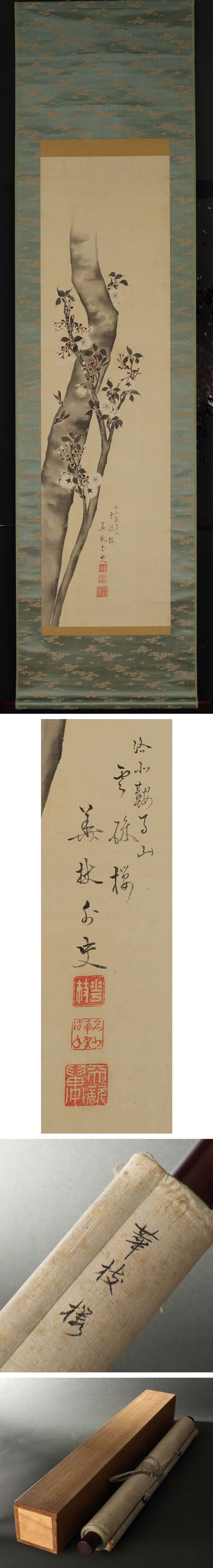 名和華杖の桜図です。 鞍馬山の銘桜である「雲珠桜(うずさくら)」を画いた一幅です。 華杖は名和長年二十三世の末裔を称し、「名和南賀津年(長恒)」の落款で知られるとともに、広瀬花隠の門人として著名でした。柳田国男の親戚筋であった医師・山崎珉平の自叙伝『山崎珉平昔談』では、珉平の父・山崎謙吾が「名和長恒」を一年間土蔵で匿った記録があるなど、勤皇志士としても記録が遺ります。 但し、明治期に華族に列せられた元筑後柳河藩士・名和男爵家の系譜『名和氏紀事』には「十郎兵衛長恒」が存在するものの、時代と世代が合わず、別系とみられます。更に松浦静山の『甲子夜話』ならびに山田孝雄『櫻史』など、広瀬花隠を「名和花隠」とする資料もあり、前述『名和氏紀事』に「此の外洛東聖護院村に名和氏を称せる者あるよしなれどいまだ其の系譜を見ず」との記述とともに着目されます。 彼の足跡は間違いなく桜に憑かれた畸人・三熊花(思孝)や、桜宮の再興に生涯を懸けた広瀬花隠の系譜を継ぐものでしょう。謎多き名和長年の末裔の遺した逸品です。 ◆名和華杖 幕末期の絵師。名は長恒。名和長年二十三世の末裔を称し、広瀬花隠の門人として知られる。勤皇志士としての記録も遺る。明治18(1885)年、三峰神社に「三十六種桜図」屏風を寄進した。 付属:時代箱が付属します。 寸法:高さ193cm、幅49cm(最大幅。若干の誤差はご了承下さい) 状態:経年のイタミがございます。 |
