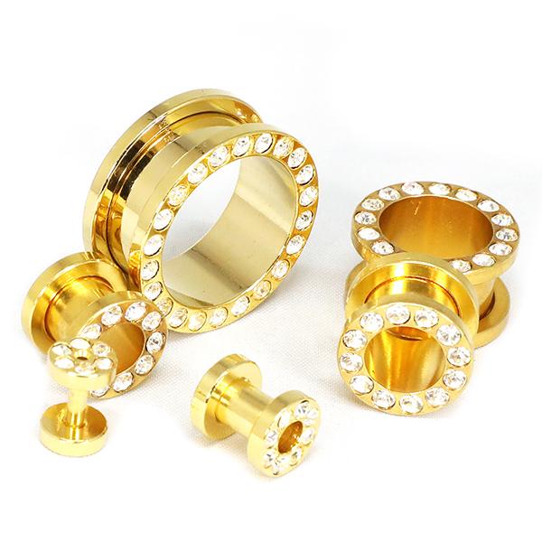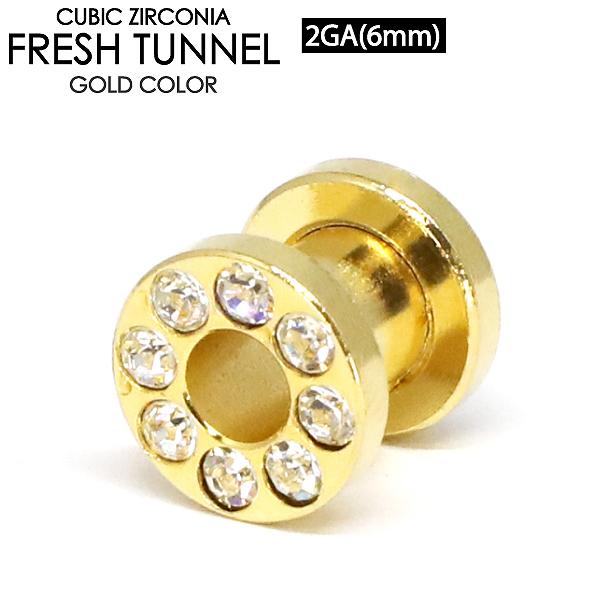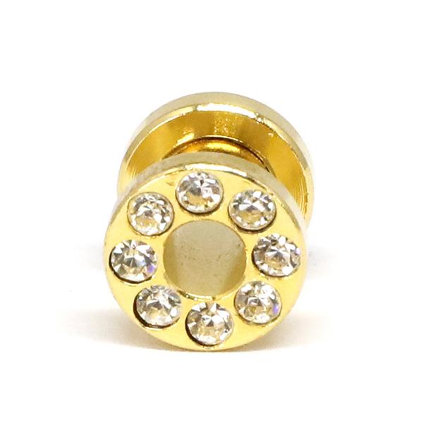 ボディピアス フレッシュトンネル ゴールド ラインストーン付 2G(6mm) サージカルステンレス316L ゴージャス クリアジュエル仕様 2ゲージ