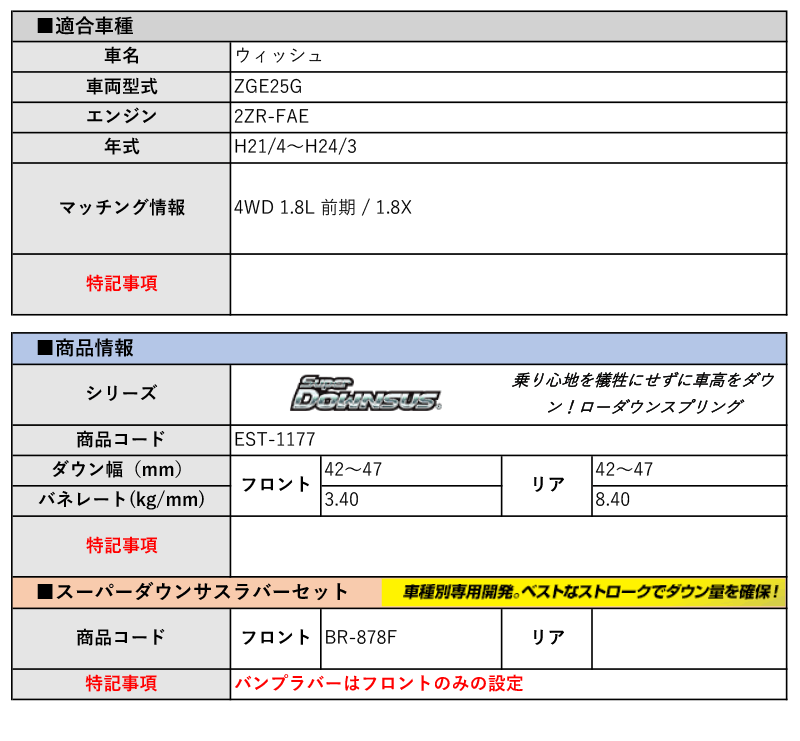 [エスペリア]ZGE25G ウィッシュ_1.8X(4WD 1.8L 前期 _H21/4~H24/3)用スーパーダウンサス&バンプラバー[車検対応] 收藏