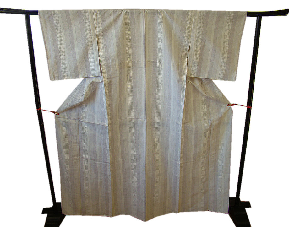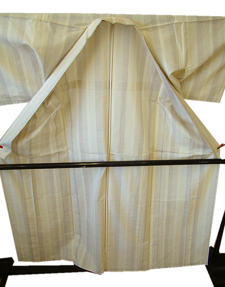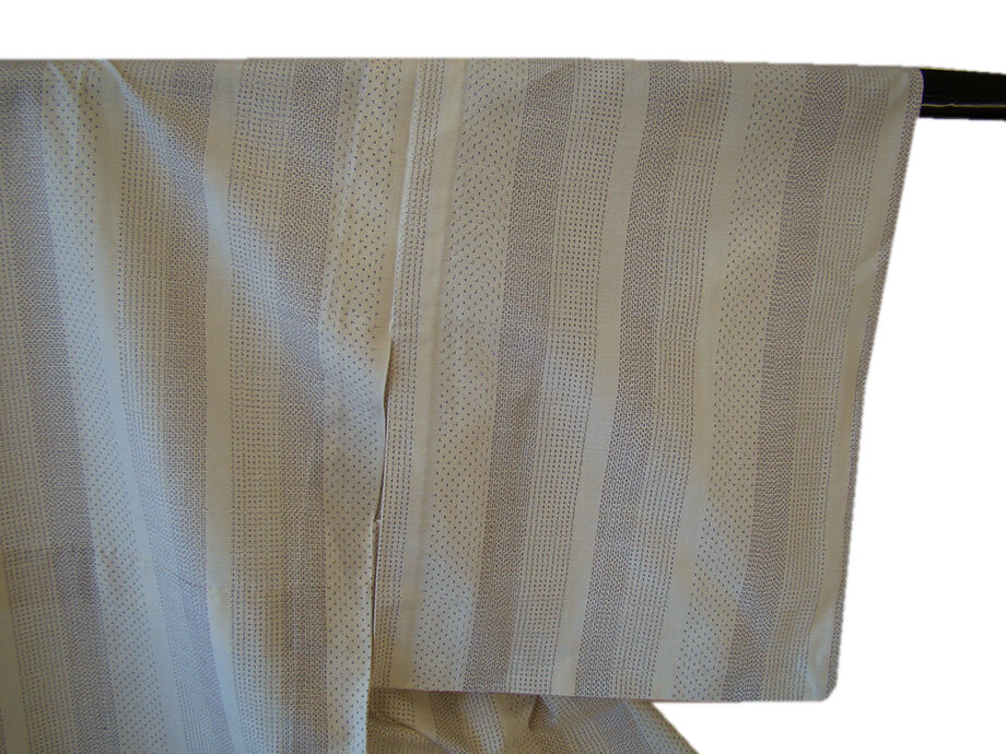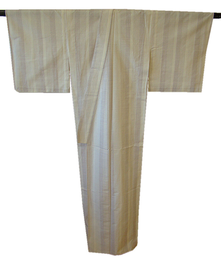 | 商品説明 | こちらのお品は「単衣」ですので5月、6月、9月にお召頂ければと思います。 着物には、大きく分けて「袷(あわせ)の着物」と「単衣(ひとえ)の着物」と「夏着物」があります。 反物(表地)を着物に仕立てるときに、裏地類をつけるものを袷の着物、 つけないものを単衣の着物と呼び、胴裏や八掛といった裏地がつかない一枚ものの着物です。 また裏地がないため、座る時などにヒップのラインが目立たないよう、 居敷当て(いしきあて)の生地をつけることもあります。 居敷当ては付いておりません。 しなやかでさらりとして手触り良く着心地良い涼やかな風合いの十日町紬地、 象牙色地に葡萄鼠色の縞の織柄が洒落感高い着物姿を演出しております。 また、バチ衿仕立てとなっております。 |