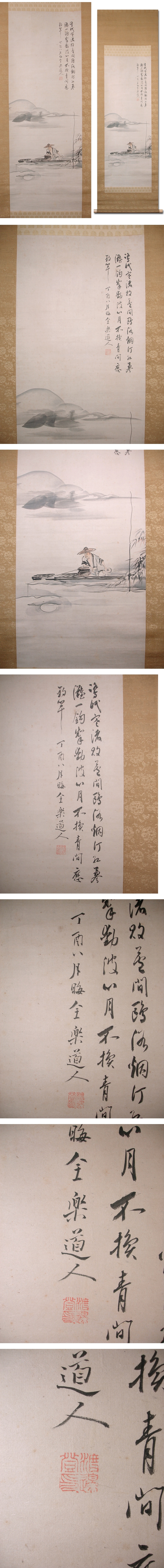 花◆名家旧蔵【渡辺崋山】真筆 紙本彩色 月下独釣図 男爵九鬼家ほか所蔵品売立目録掲載品 渡辺小華極め箱 売立目録付 收藏
