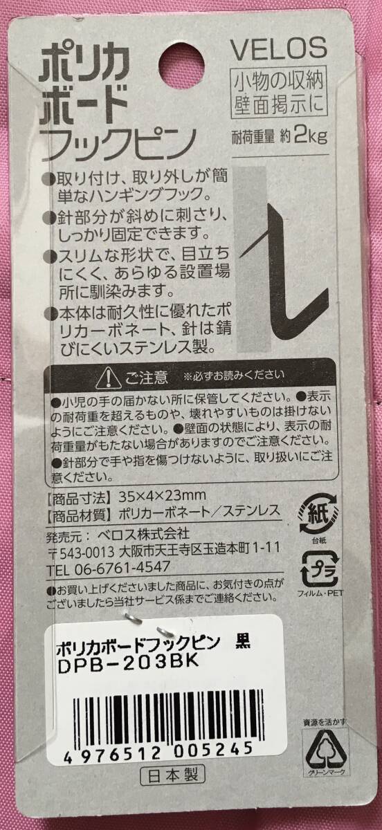 ■画像通りの、ベロス ポリカボード 壁面用フック DPB-203BKの2個セットです。