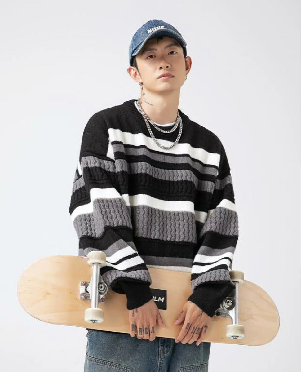 【開封のみ】ANGEL CITIZ★男性用セーター 冬の男性ストライプのセーターの男性のカジュアルなプルオーバー セーター メンズ M ブラック 收藏