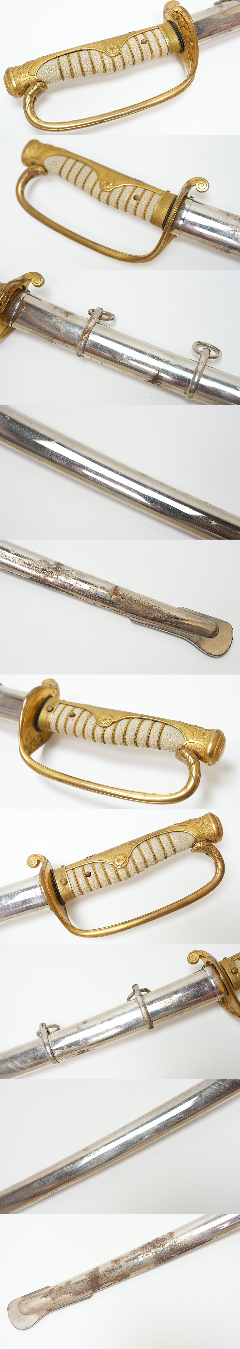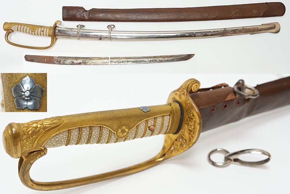 桔梗家紋 旧日本帝国陸軍 尉官用両手握サーベル型軍刀拵 着脱式第二佩鐶 着脱式野戦革覆 切断済刀身入 駐爪・ ボタン・バネ・正常作動 收藏