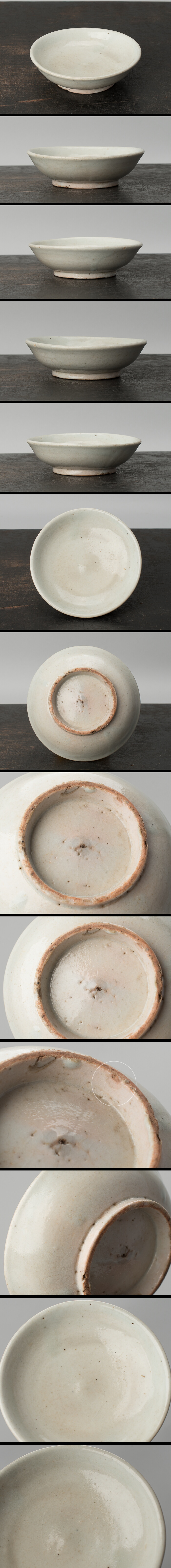 李朝の小皿。李朝時代。箱無。 幅10cmほどで見込みも多少深さありますので、平盃としてもお使い いただけそうです。ぐい呑としては浅めですので、画像・下の サイズでご確認ください。 サイズは、幅約101-103mm、高さ約29-31mm。 見込みの深さ約17-18mm。 高台内側にソゲあります。 状態、詳細は画像でご確認ください。 |