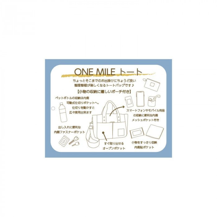 | ちょっとそこまでのお出掛けにちょうど良い、シンプルなONE MILE整理整頓手提げ。前本体にはすぐ取り出せるタックポケット付き。内側は整理整頓に嬉しい機能ポケット付きで、バッグの中でごちゃごちゃしやすい小物もきれいに収納して頂けます。モバイル用品の収納に便利なメッシュポケット付き。小物の収納に嬉しいポーチも付いており、機能が充実しています。 |
