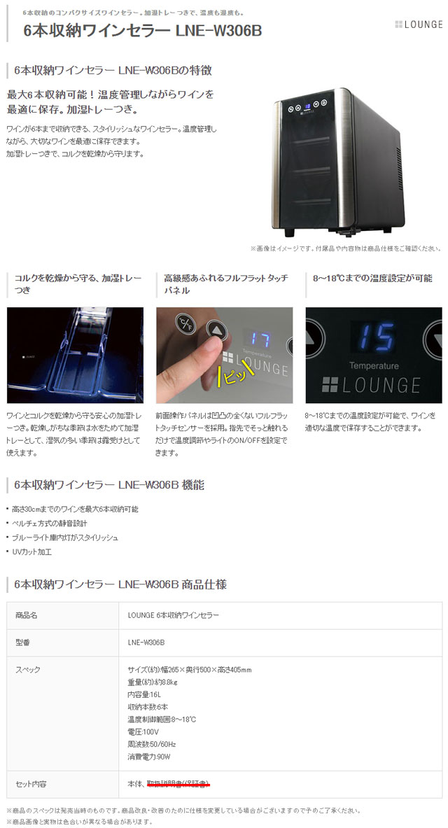 オークセール(シロカ) ワインセラー +LOUNGE LNE-W306B を出品いたします。 ■特徴■ 最大6本収納可能! 温度管理しながらワインを最適に保存。 加湿トレーつき。 ワインが6本まで収納できる、 スタイリッシュなワインセラー。 温度管理しながら、 大切なワインを最適に保存できます。 加湿トレーつきで、コルクを乾燥から守ります。 コルクを乾燥から守る、加湿トレーつき ワインとコルクを乾燥から守る安心の加湿トレーつき。 乾燥しがちな季節は水をためて加湿トレーとして、 湿気の多い季節は露受けとして使えます。 高級感あふれるフルフラットタッチパネル 前面操作パネルは凹凸の全くない フルフラットタッチセンサーを採用。 指先でそっと触れるだけで 温度調節やライトのON/OFFを設定できます。 8~18℃までの温度設定が可能 8~18℃までの温度設定が可能で、 ワインを適切な温度で保存することができます。 ■仕様■