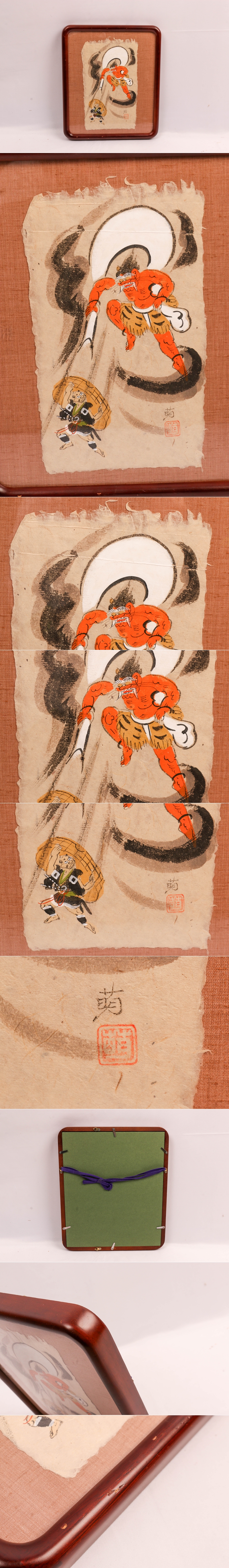 【SAG】野坂萌 大津絵 風神と奴 紙本 肉筆 直筆サイン 落款 額装 本物保証 收藏