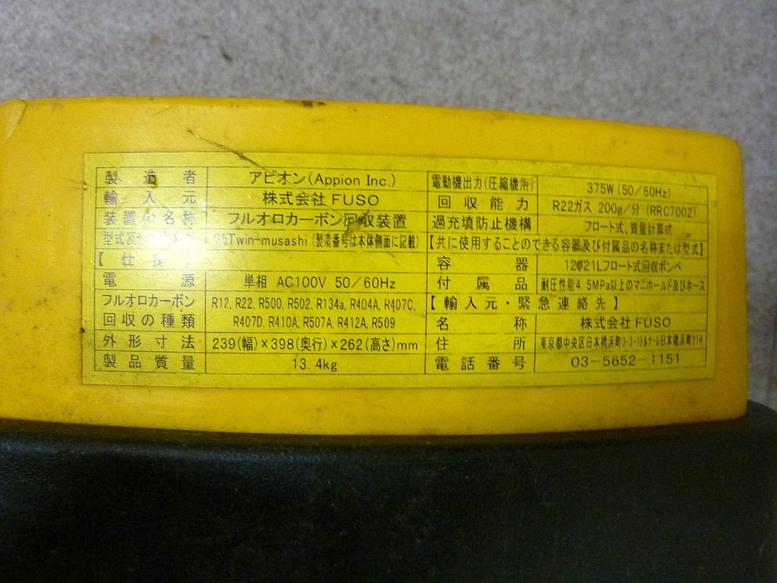 | 商品説明 | アピオンのフロン回収機 G5TWIN武蔵 です。 |