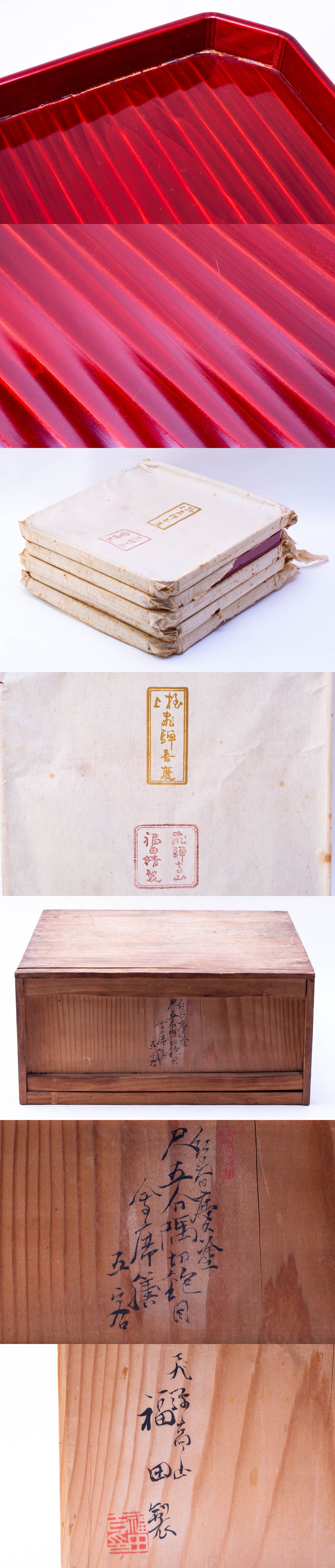 福田製 飛騨高山 紅春慶塗 尺五分隅切鉋同寄席膳 漆器 漆芸 木工芸 日本古美術 伝統工芸 5客 共箱付 #39990 收藏
