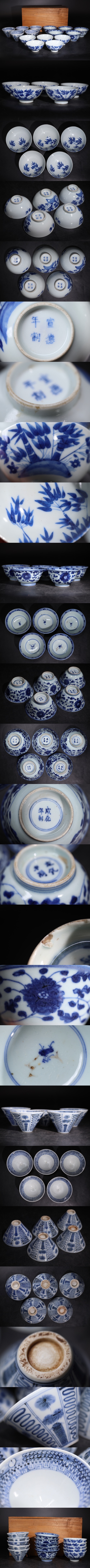 宣徳年製 成化年製 底款 染付 煎茶碗 十五客 木箱付 / 明 清 中国美術 茶器 煎茶道具 .G3372 收藏