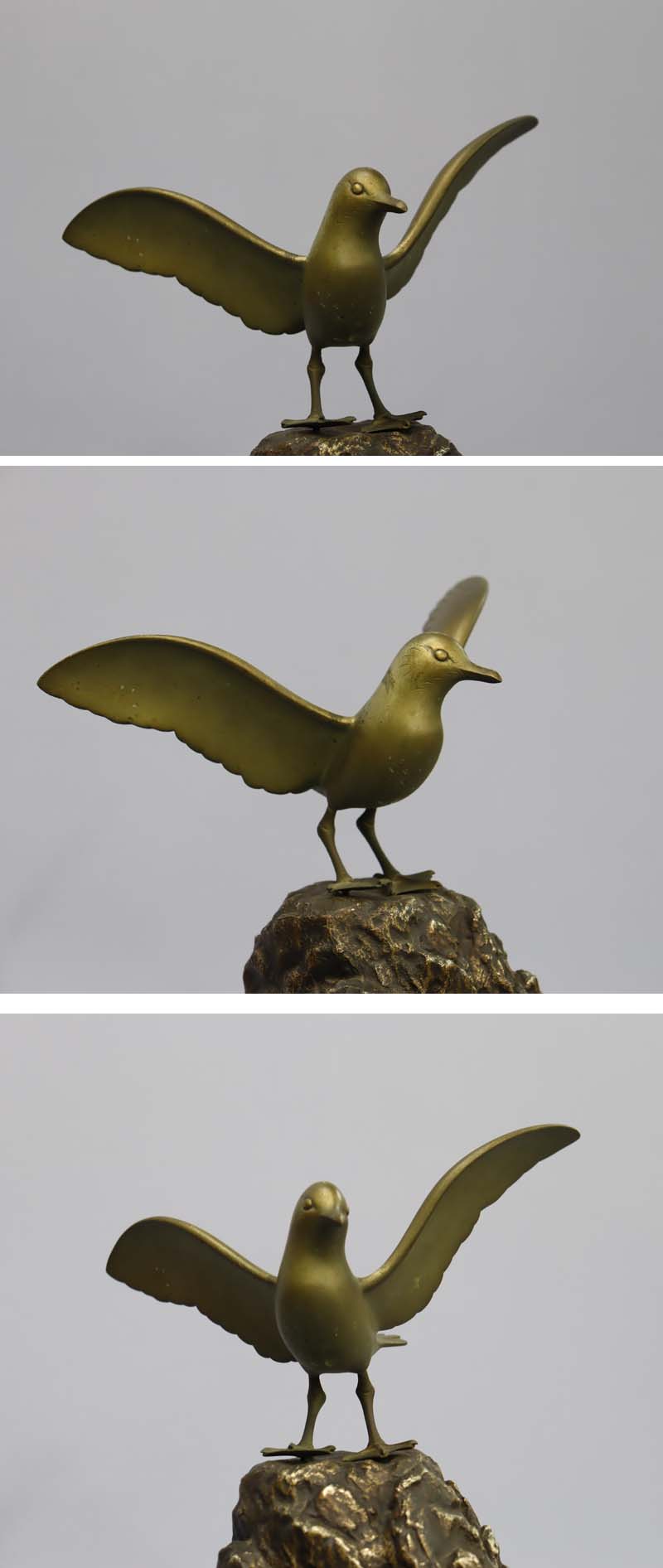 真燁作の岩上に鳥置物。銅製。大正~昭和初期頃の作。