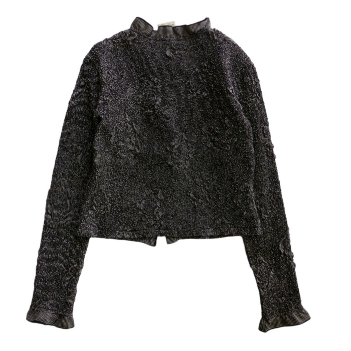 | 細かなステッチワークにより生み出されるシワが魅力のフリルジャケット。 シャネルらしいカメリアをモチーフとしたデザイン。 緻密に計算されたシワ感は、美しくシャネルの提案する女性像を体現。 エラスタン×ポリエステルのストレッチの効いた生地感が快適なライトアウターとして重宝します。 コンパクトなサイジングとモダンで洗練された雰囲気あふれる逸品です。 |