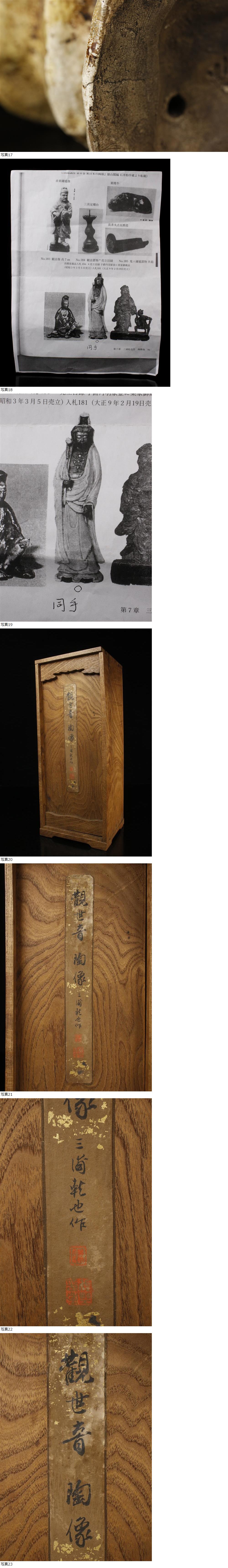 260123G04* * * 商品詳細 * * * ここでしか出逢うことのできない唯一の美をご紹介させて頂きます。 木彫作品とはまた異なる味わいがある陶像、観音菩薩像のご紹介です。 その精巧な造りは陶器であることを忘れるほどの出来栄えで、 細部まで実に繊細に造り込まれています。 渋く深みのある温かい肌地からは体温が伝わって来るかのようです。 柔らかな顔立ちにしなやかな佇まい、造り手の技が遺憾なく発揮された 上品で神秘性を帯びた時代の逸品です。 この機会に是非お手元にてご堪能下さい。 三浦乾也 江戸末期から明治初期の陶工。江戸の人。 号、天禄堂。乾也焼を創始。 また、破笠はりつ細工にもすぐれ、その手法を応用した かんざし・笄こうがいなどの珠たまは乾也玉とよばれて人気を博した。 船・ガラスなども製造。 ■商品内容/仏像、箱 ■サイズ/横10cm×高33.5cm×奥行7.5㎝ 箱:横17cm×高42.5cm×奥行15㎝ ■状態/スレ、キズ、窯被、直し、箱にスレ、キズ、欠け、シミがございます。 箱蓋の閉まりが悪く開け閉めが固くなっています。 ※写真にてご確認、ご了承の上ご入札下さい。 * * * 支払詳細 * * * !かんたん決済 * * * 発送詳細 * * * 入金確認後3営業日以内に発送致します。 ※直接引き取りも可能です。 60~160サイズにつきましては 佐川急便、ゆうパックのどちらかで発送いたします。 ゆうパック発送の場合、弊社の発送日から追跡サービスに問合せ番号が反映されるまで 約1日ほどお時間がかかりますのでご了承下さい。 * * * 注意事項 * * * 運送中の破損があった場合は速やかに当社までご連絡下さい。 保険を利用するのに受取連絡後に運送会社による現場での破損状況確認が必要となります。 勝手に返送されますと保険の適用外となりますのでご注意ください。 * * * * * * お問い合わせ:082-236-8669 |