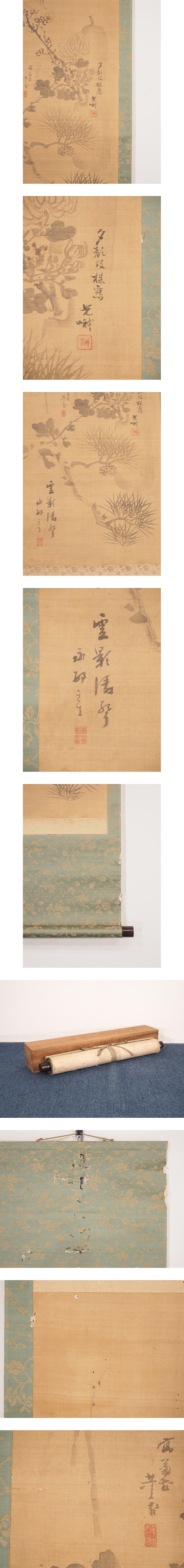 【真作】【渡鹿庵】[柴田是真 他 寄書き] 17415 掛軸 日本画 松竹梅菊蝶図 合箱 絹本 花鳥図 在銘 收藏