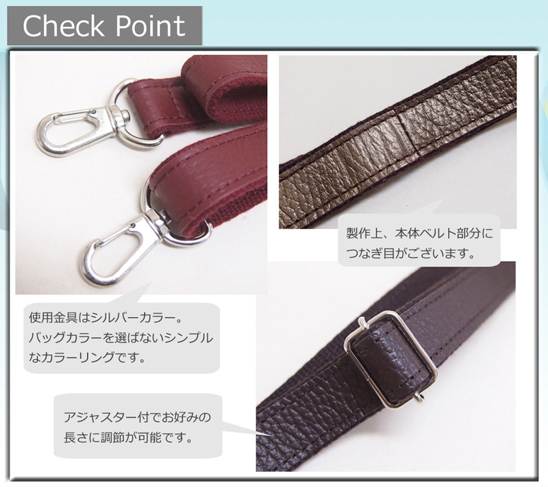<Item information> ショルダーストラップ メーカー参考価格(税込) 2,750円 本革(牛革)のショルダーストラップです。裏張りは全面にキャンバス素材を使用。日本製の丁寧な作りです。幅は20mmでやや細めで、上品なデザインのバッグにも合わせやすいデザインです。長さはお好みで調節可能(約70-124cm)。表レザーはシュリンク加工が施されたキズ付きにくく目立ちにくい質感なので気兼ねなく使えます。金具はシンプルなシルバーカラー。カジュアルになりすぎない上品なデザインです。お手持ちのバッグの付け替えやハンドメイドのパーツとしておすすめです。 注)こちらはで700g前後のバッグに取り付ける事を想定して作られております。 極端に負荷をかけますと破損の原因となりますので、ご注意ください。※こちらは製作上、本体ベルト部分につなぎ目がございます。 condition :新品 brand :- material :牛革 (裏張りファブリック) size :長さ約70-124cm(金具含む) weight :60g color :ブロンズ 裏地 :あり 生産国:日本 |
