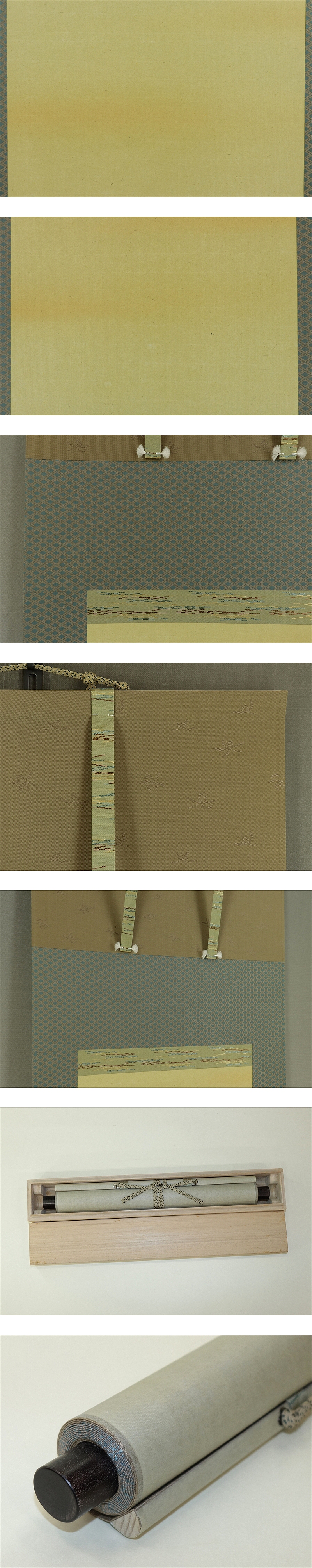 小野竹喬 おの-ちっきょう(1889-1979) 日本画家。岡山県生。名は英吉。竹内栖鳳の門に学ぶ。 大正7年土田麦僊らと国画創作協会を創立。 帝展・新文展で活躍し、戦後は日展で重きを成す。一貫して日本の自然に取り組み 清澄な透明感の中に豊かな詩情と独特の滋味のある画風で、 風景画の分野に確固とした新視覚を示し続けた。京都絵専教授。 芸術院会員。文化功労者。文化勲章受章。昭和54年(1979)歿、89才。 本紙は、染み痕があります。 表装は、良好です。 【サイズ】 作品 横約7cm×縦約36cm 表装 横約38cm×縦約168cm |