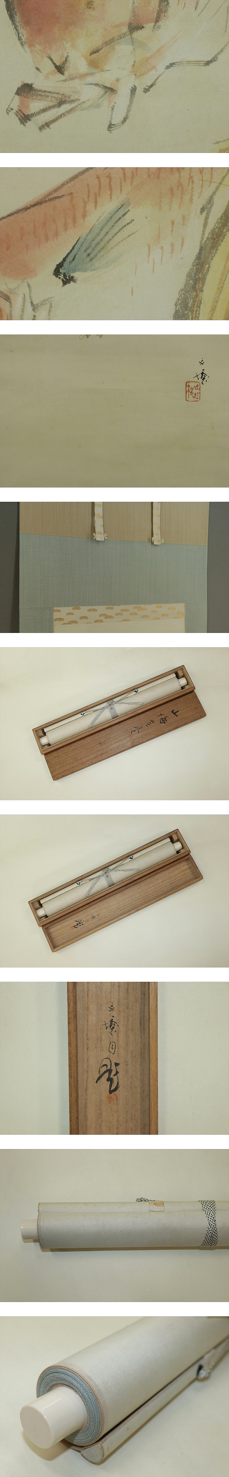 林文塘 はやし-ぶんとう(1882-1966) 日本画家。京都生。名は光三郎。 前川文嶺・山元春挙に学び、山水画を得意とする。 文展入選後、井口華秋・池田桂仙らと反帝展の自由な制作を目指して日本自由画壇を結成した。 昭和41年(1966)歿、84才。 本紙は、染み、軽い折れ、皺があります。 表装は、染み、軽い皺があります。 【サイズ】 作品 横約29cm×縦約125cm 表装 横約41.5cm×縦約207cm |