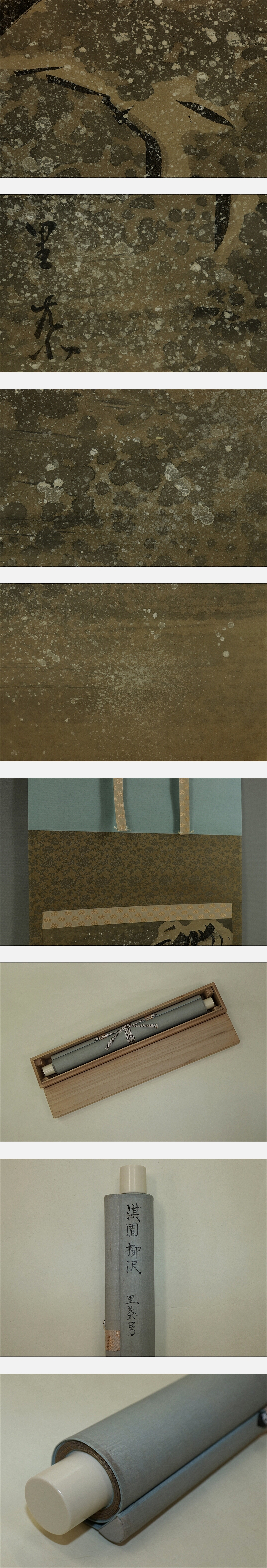 柳沢淇園 やなぎさわ-きえん(1704-1758) 江戸時代中期の画家。 宝永元年生まれ。大和(奈良県)郡山藩の重臣。 文人画の先駆者の一人で,彩色の花鳥画と指先で描く墨竹画に優れた。 更に詩文,和歌,三味線など,多芸多才の風流人として知られた。 宝暦8年9月5日死去。55歳。 本姓は曾禰。名は里恭(さととも)。字は公美。別名に柳里恭(りゅう-りきょう)。 本紙は、軽い染み、皺があります。 表装は、染み、皺があります。 【サイズ】 作品 横約36.5cm×縦約49cm 表装 横約41cm×縦約136cm |