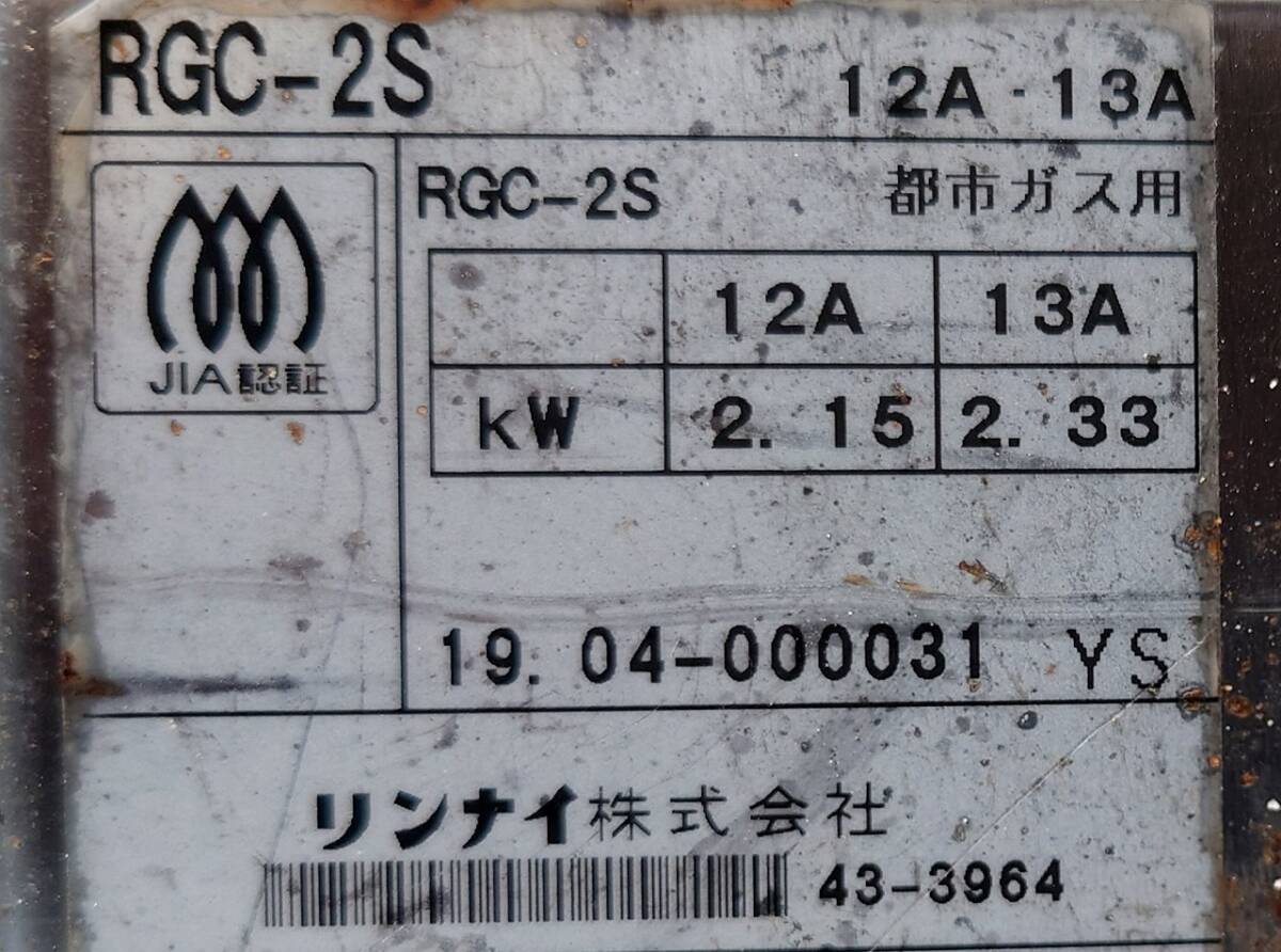 | 卓上ガス赤外線グリラー 都市ガス リンナイ RGC-2S 2019年 | |