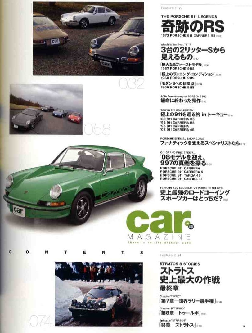 書名/記事: 08.1 カーマガジン(CAR magazine) 355/奇跡の911 - 1973ポルシェ911カレラRS/'67 911S/'68 911S/'69 911S/1967 912タルガ、ポルシェ・スペシャルショップ・ガイド、911カレラS/カレラSカブリオレ/タルガ4S、ポルシェGT3×フェラーリ430スクーデリア、ストラトス史上最大の作戦(最終章) - WRC/トゥールボ、アストンマーチンDBS、アウディ A4、アウディA8、レクサス IS F、ホンダフィット、スバルインプレッサ WRX STI、ボルボXC70、1968 フェラーリ365 GTB/4 デイトナ、2007 ヒストリックオートモビル・フェスティバル・イン・ジャパン、東京コンコース・デレガンス2007、F1 GP RD.17ブラジル、…