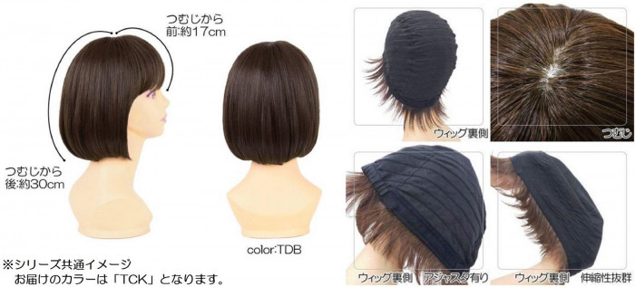 | サイズ | 【キャップ】キャップ周り約:3cm、フロントからバックまで約:2cm、耳(トップから耳)まで約:4cm、【ウィッグ】つむじから前:約17cm、つむじから後:約30cm 個装サイズ:7.5×21.0×15.0cm |