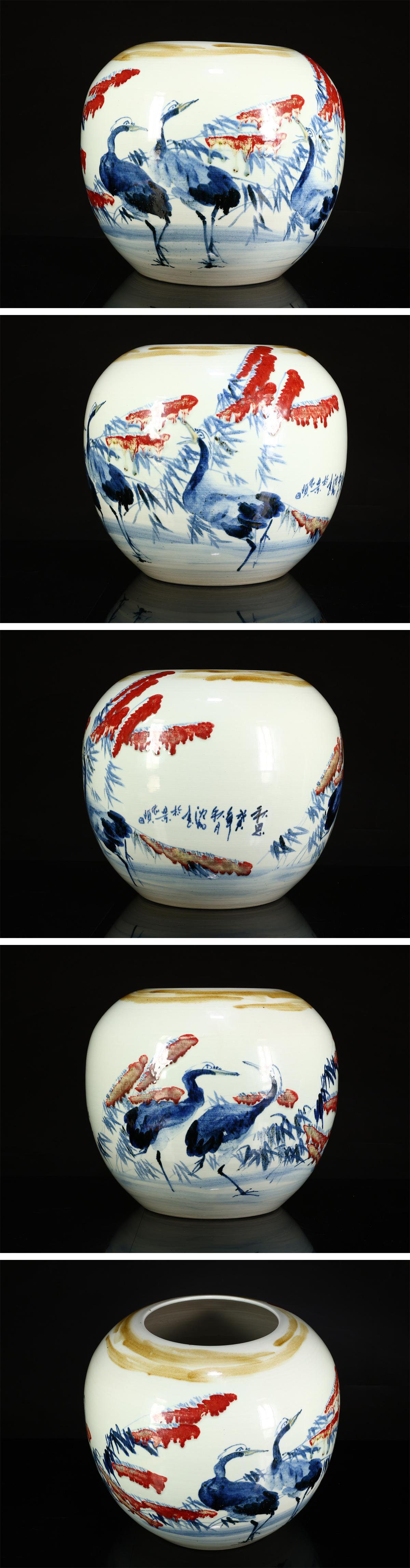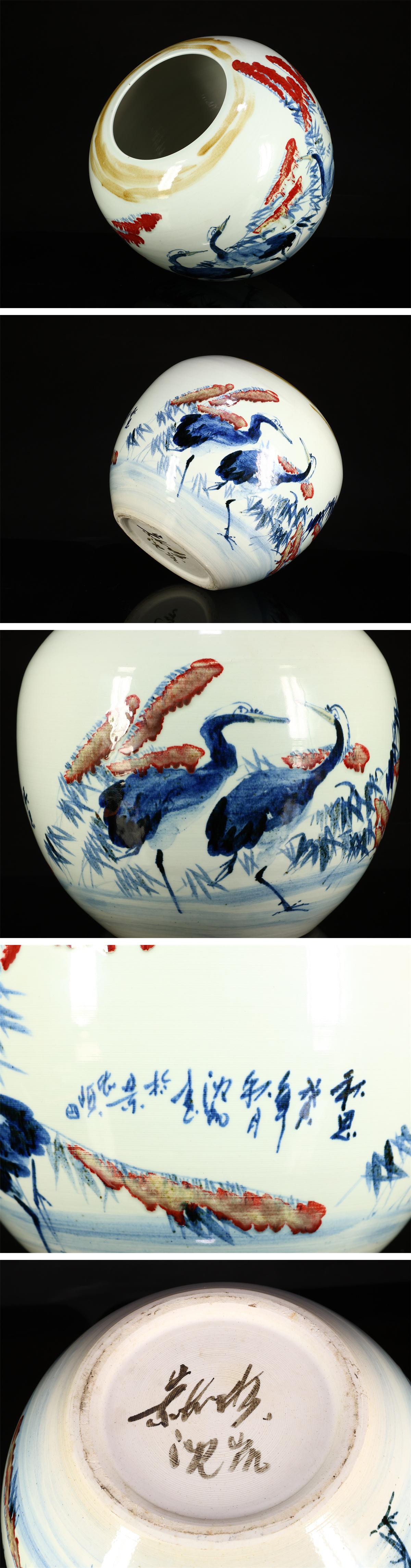 【吉】CM865 唐物 【景徳鎮 沈凱】製 青華釉里紅 国画秋草水鳥図 大壺 高33㎝ 径36㎝/本物保証 美品N! 收藏