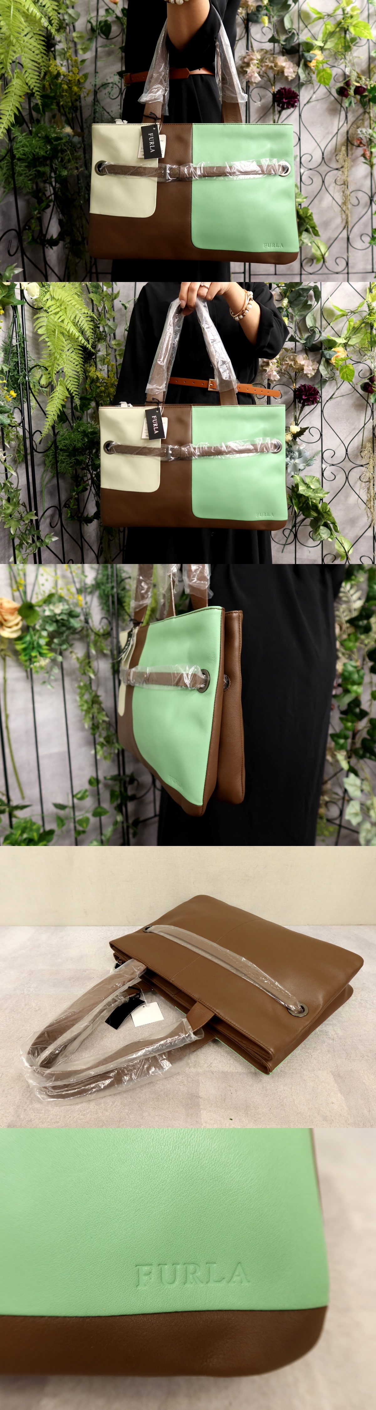 ●未使用 保管品●FURLA フルラ●ロゴ型押し●カーフ レザー 本革●トート バッグ●茶 ミントグリーン パールホワイト●B5 かばん●Js60968 收藏