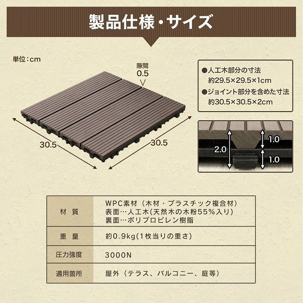 | \ 天然木粉を約55%使用!敷くだけでベランダやお庭がオシャレに! / パズルみたいにサイドの凹凸を繋ぎ合わせるだけ! 簡単に施工が出来るジョイント式タイル♪ ベランダの雰囲気を変えたり劣化してきたベランダの修復に最適です! 雨や日差しによる劣化に強く耐腐食性もある人工木を使用。 55%の天然木粉と45%の樹脂で出来ており、天然木製と比べると定期的なお手入れも不要! 小さなお子様やペットにも安心。さらっとした感触でささくれや釘による怪我の心配もなし。 安全に長期間使用できる優れものです! 【おすすめポイント】 ・天然木よりも頑丈!! ・簡単に設置可能なジョイント式! ・雨や水に強くお手入れ簡単! 【こんな場所におすすめ】 ・ベランダやテラスに ・お庭に ・玄関先に ・屋上に 【商品詳細】 枚数:54枚 カラー:ダークブラウン 交互タイプ サイズ: 人工木部分の寸法(約):幅29.5cm×長さ29.5cm×高さ1cm ジョイント部分を含めた寸法(約):幅30.5cm×長さ30.5cm×高さ2cm 重量(約):1枚あたり 0.9kg 材質: WPC素材(木材・プラスチック複合材) 表面:人工木(天然木粉55%入り) 裏面:ポリプロピレン樹脂 【注意事項】 ・海外製品のため多少の傷、汚れがある場合がございますがご了承ください。 ・商品は、モニターによって色合いが異なって見える場合があります。 ・仕様・デザインは改良のため予告なく変更することがあります。 【もちろん新品未使用品です】 商品コード:ACE004WD |